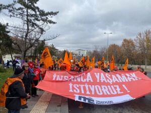 Mitingde “Asgari yaşamak istemiyoruz”, “Sermayeye değil, emekçiye bütçe”, “Hak, hukuk, adalet”, “Kurtuluş yok tek başına, ya hep beraber ya hiç birimiz” sloganları atıldı.