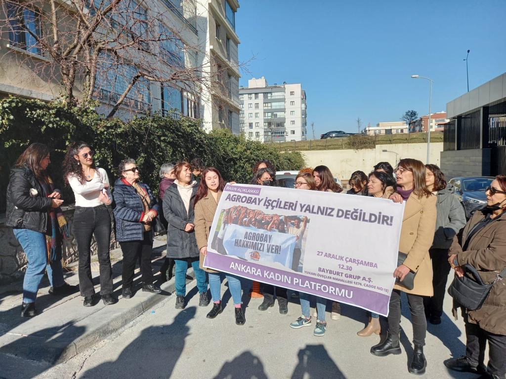 Ankara Kadın Platformu’nun çağrısıyla bugün (27 Aralık) saat 12.30’da Şenbay Holding binası önünde Bayburt Grup A.Ş.’ye karşı Agrobay işçisi direnen kadınlarla dayanışma eylemi yapıldı.