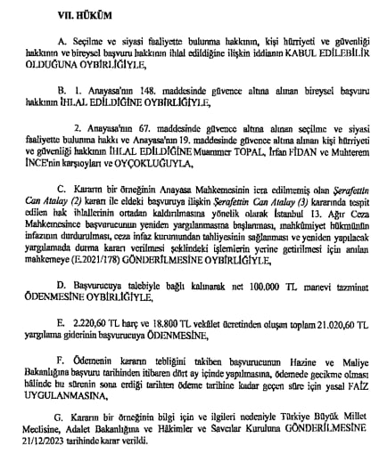 Ayrıca karar metninin İstanbul 13. Ağır Ceza Mahkemesi’ne gönderilmesi, hak ihlalinin sonlandırılması için Atalay’ın tahliye edilmesi de hüküm içinde yer aldı. Karar hükmünün tamamı şöyle: