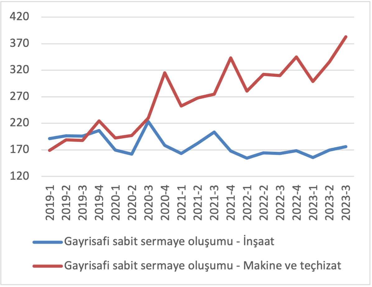 İlk olarak aşağıdaki grafik yardımıyla yatırımlardaki artışa bakalım. Pandemi döneminden itibaren makine ve teçhizat yatırımları ile inşaat yatırımları arasında keskin bir ayrışma yaşanıyor ve ilk kalemdeki yatırımlar muazzam bir şekilde artarken ikinci kalemdeki yatırımlar neredeyse değişmeden kalıyor. Bu özellikle 2018’deki döviz krizine kadar geçerli olan ‘inşaat odaklı’ büyümenin sonunun çoktan geldiğini ve artık yatırımların inşaattan sanayiye kaymaya başladığını gösteriyor. Bu noktayı ileriki haftalarda açacağım, o yüzden şimdilik bu kadarını söylemekle yetineyim ( Aşağıdaki grafikte gayrisafi sabit sermaye oluşumu, zincirlenmiş hacim endeksi, III. Çeyrek: Temmuz-Eylül, 2023 verisini kullandım).