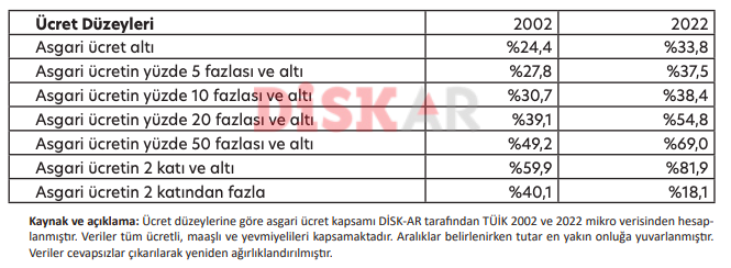 Elbette bu yatırımlar, düşük faiz kadar ücretlerin düşürülmesine de dayanıyor. Bu anlamıyla Nebati programı ile Şimşek programı birbirinin devamı olarak görülmeli. DİSK-AR’ın geçtiğimiz hafta açıkladığı asgari ücret raporunda net bir şekilde ortaya konulduğu gibi (aşağıdaki tablo raporda s. 31’de yer alıyor) ücretlerin baskılanmasına dayanan mevcut birikim/büyüme modeli sonucunda toplumun geneline yayılan bir asgari ücretleşme söz konusu. Emek gücünün bu kadar ucuzladığı, toplumsal muhalefetin gerilemesi nedeniyle emeğin pazarlık gücünün daraldığı ve otoriter konsolidasyon süreci sayesinde herhangi bir itirazın sert bir şekilde bastırılması gibi nedenler, işsizlikteki azalışın gerisindeki bazı dinamikler olarak görülebilir.