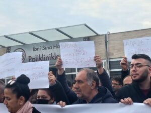İşçiler tüm engelleme çabalarına rağmen hastane önünde açıklama yaptı.