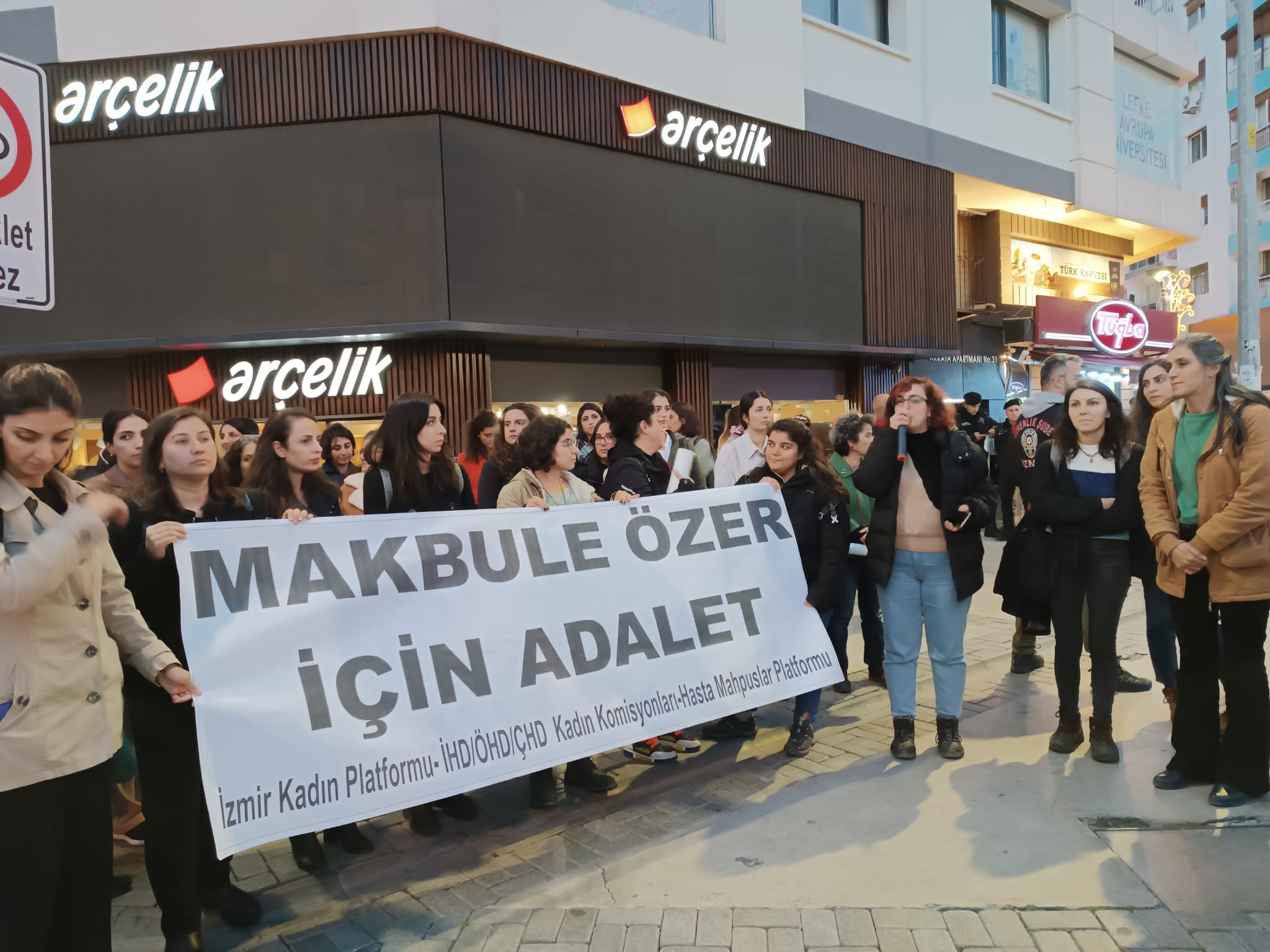 81 yaşındaki Makbule Özer’in ertelenmiş cezası tekrar gündeme getirilerek ATK’nin birçok hastalığına rağmen verdiği “cezaevinde kalabilir” raporu ile 4 Aralık Pazartesi günü yeniden hapishaneye gönderilmek istenmesi üzerine İHD, ÖHD, ÇHD, İzmir Kadın Platformu ve Hasta Mahpuslar Platformu’nun çağrısıyla bir araya gelenler eylemdeydi.