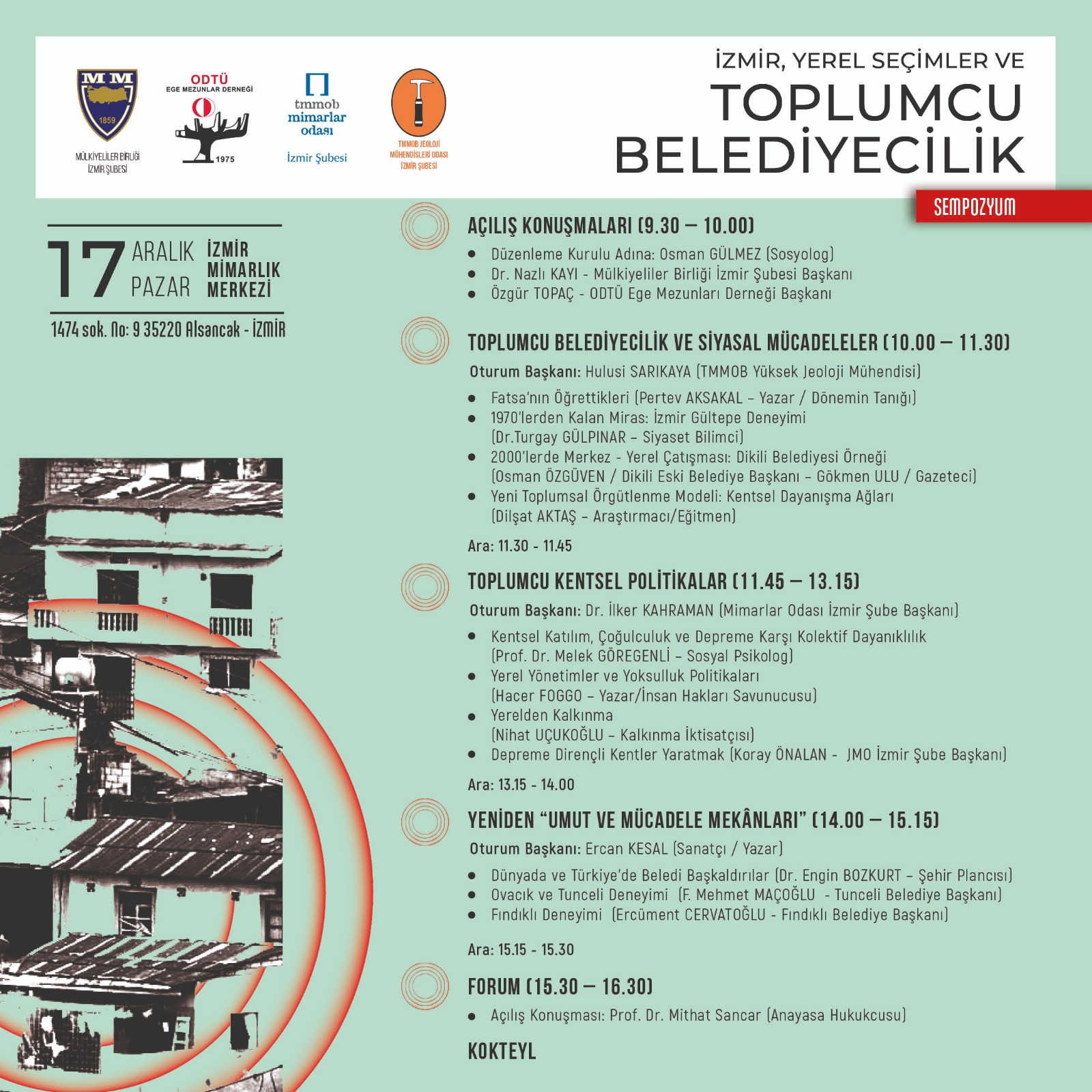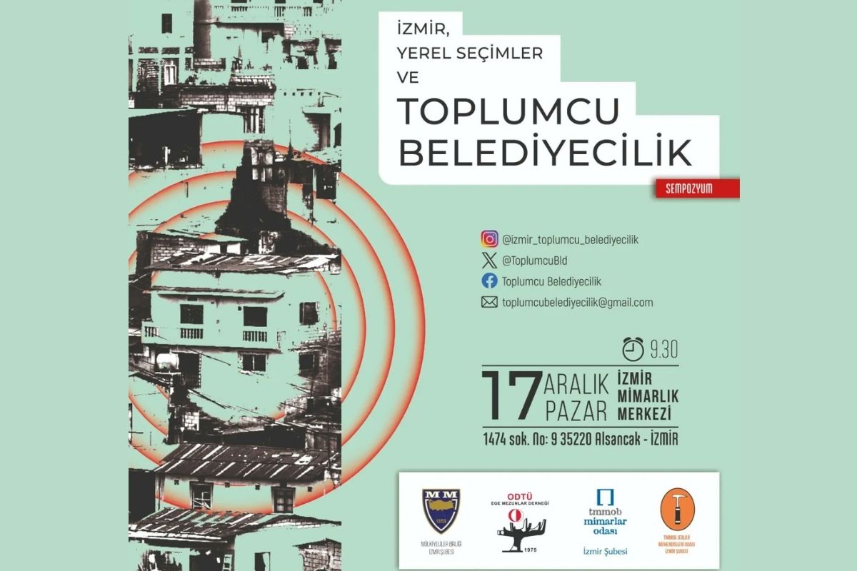 2024 Mart ayında yapılacak yerel seçimler öncesinde 17 Aralık 2023 Pazar günü İzmir Mimarlık Merkezi’nde yapılacak olan “İzmir Yerel Seçimler ve Toplumcu Belediyecilik Sempozyumu”, öne çıkan belediyecilik deneyimlerinden kentte yaşanan sorunlara kadar pek çok konuyu ele alacak