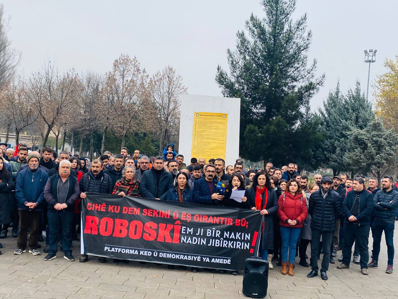 Amed Emek ve Demokrasi Platformu, Rezan ilçesinde bulunan Koşuyolu Parkı’nda basın açıklaması yaptı. Açıklamaya, Amed Emek ve Demokrasi Platform bileşenleri, DEM Parti ve DBP İl Eş Başkanları, yöneticileri ve birçok kişi katıldı. Açıklamada Kürtçe, “Zamanın durduğu ve acının ağırlaştığı yer Roboski, unutmadık, unutturmayacağız/Cıhê ku dem sekini u eş grantir bû, em Roboskî jibir nakîn nadin jibir kirin” pankartı açıldı.