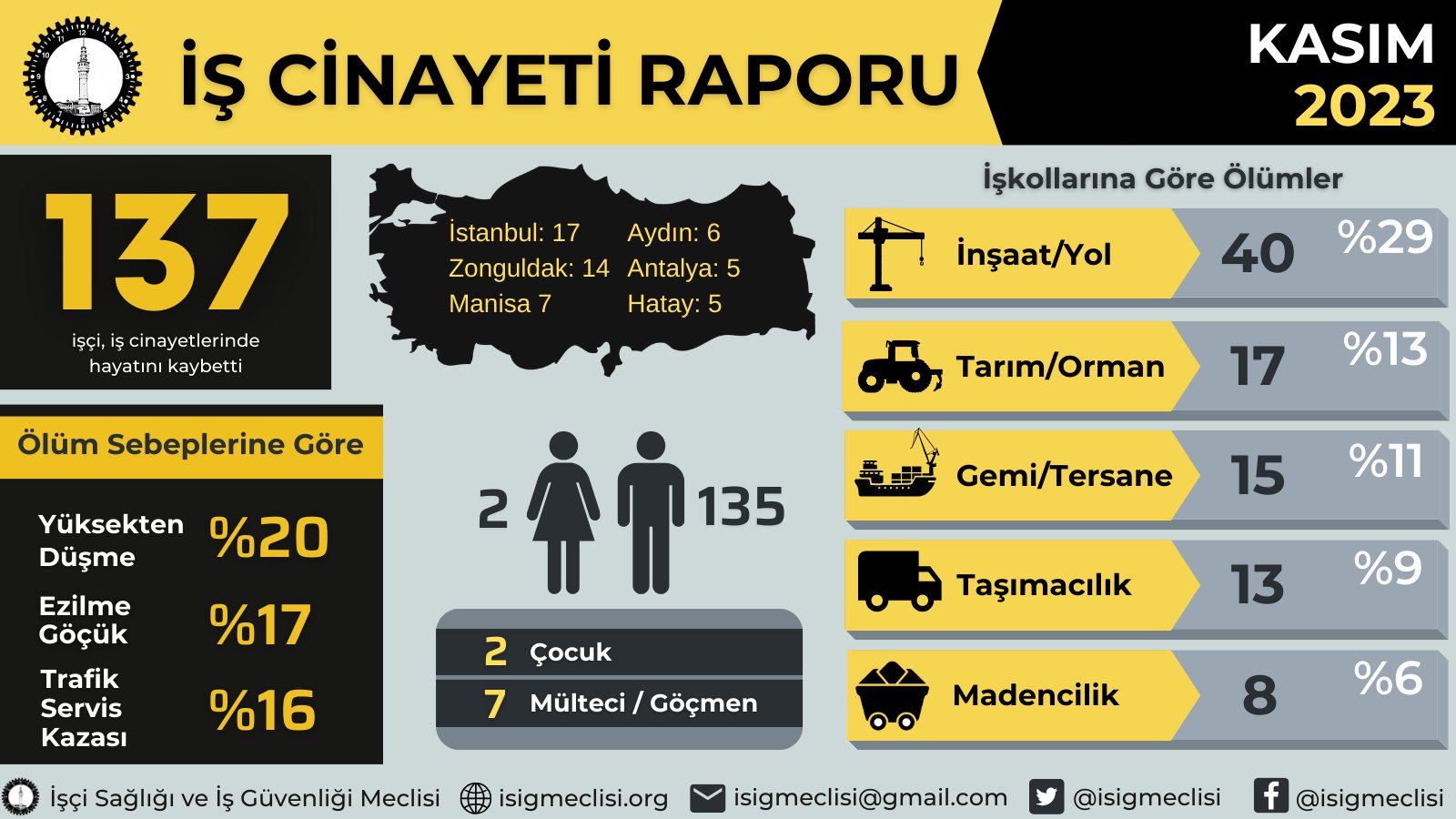 İşçi Sağlığı ve İş Güvenliği Meclisi, kasım ayı iş cinayetleri raporunu yayımladı. Rapora göre kasımda 137, 11 ayda en az 1172 işçi çalışırken yaşamını yitirdi.