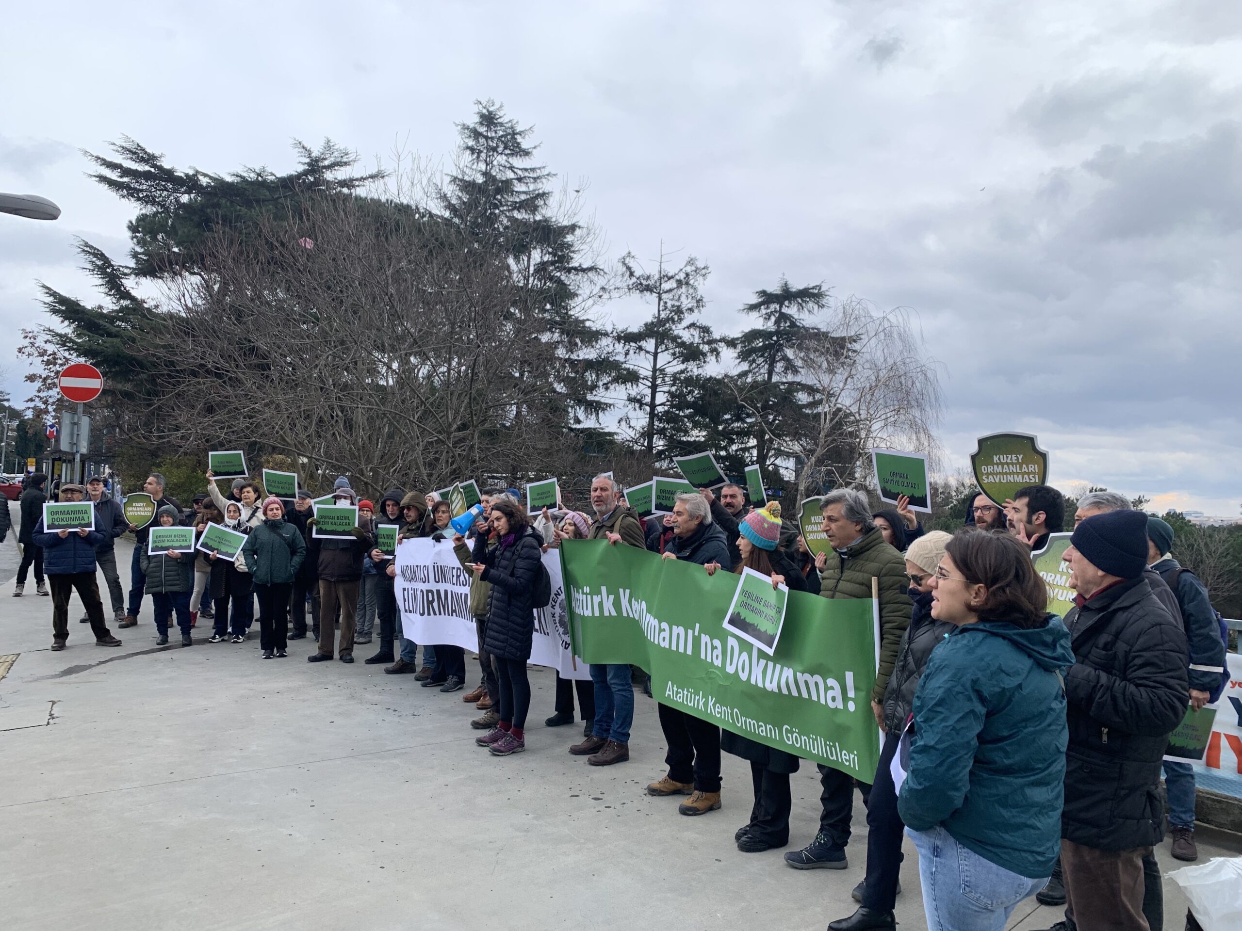 Atatürk Kent Ormanı Gönülleri çağrısıyla bugün (28 Ocak) Sarıyer Hacıosman’da bir araya gelen yaşam savunucuları, Atatürk Kent Ormanı’nın parçası olan 9 dönümlük ihalenin Mersin MHP Milletvekili Levent Uysal’ın kurduğu Nişantaşı Eğitim Vakfı’na (NEV) verilmesi ile ilgili basın açıklaması yaptı.