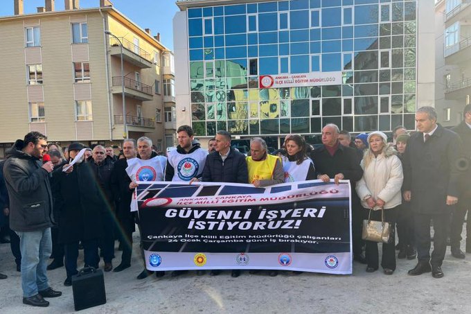 Çankaya İlçe Milli Eğitim Müdürlüğü çalışanları, “Güvenli İş Yeri İstiyoruz” talebiyle bugün iş bırakarak basın açıklaması yaptı. İş yerinde örgütlü tüm sendikaların katıldığı eyleme bütünlüklü bir katılım sağlandı. MYK üyelerimiz Kemal Irmak, İzzet İldeş ve Evrim Gülez ile… pic.twitter.com/ljvSUtWRce
