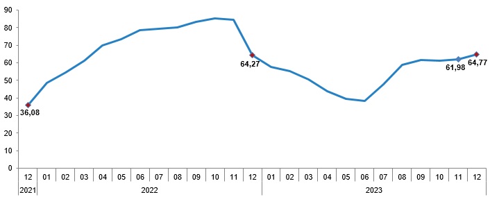 TÜİK 2023 Aralık ayına ait enflasyon hesabını paylaştı. TÜİK’in verilerine göre enflasyon bir önceki aya göre yüzde 2,97, geçen yıl aynı aya göre yüzde 64,77 oldu. Bu hesapla birlikte 2023 için yıllık enflasyon da yüzde 53,86 oldu.