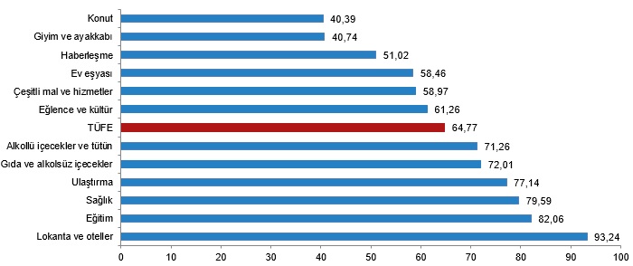 Harcama gruplarına bakıldığında eğlence, eğitim, sağlık, ulaşım, gıda ve alkollü içeceklerdeki fiyat artışının ortalama enflasyonun üzerinde olduğu görülüyor.