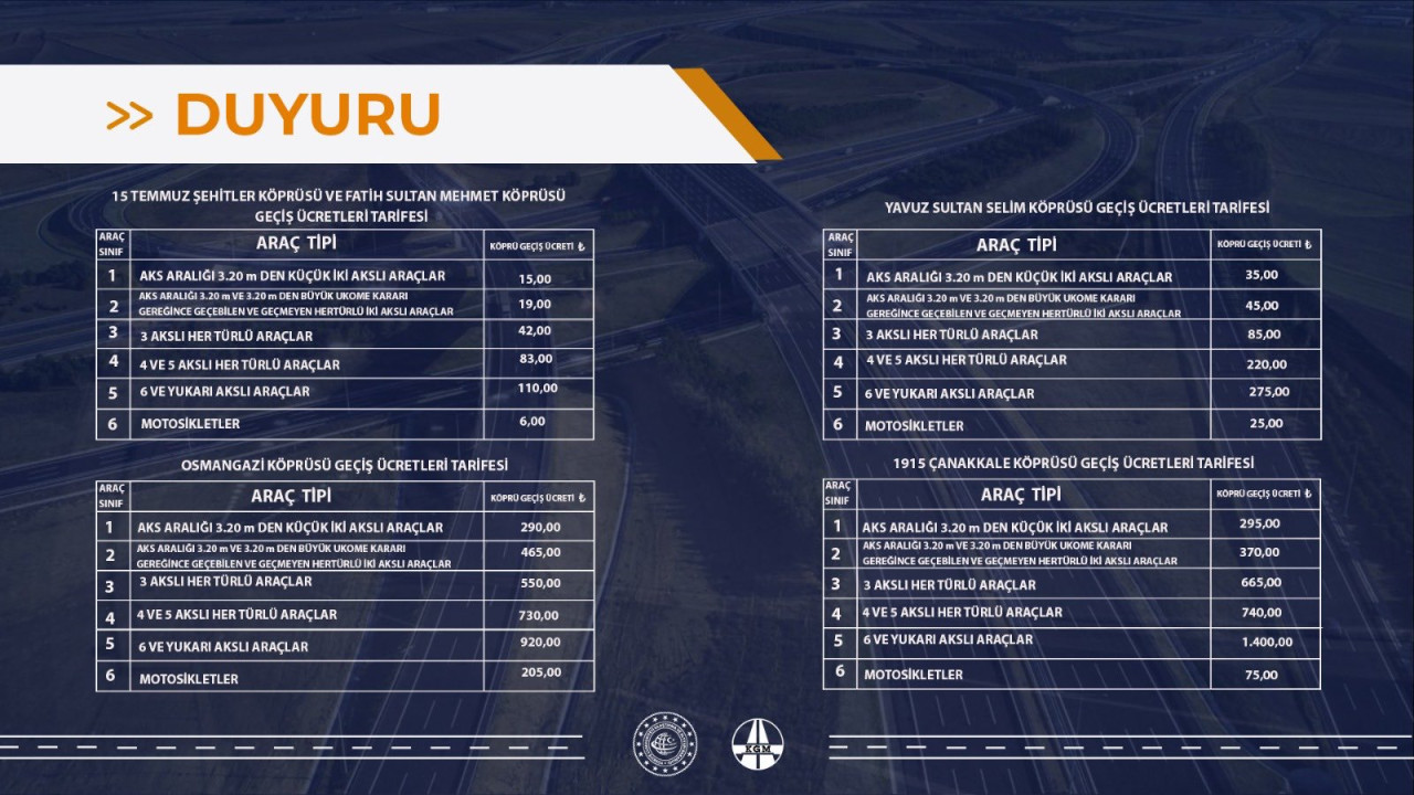 1 Ocak 2024’ten itibaren köprülerde uygulanacak olan yeni tarifenin tamamı ise şu şekilde: