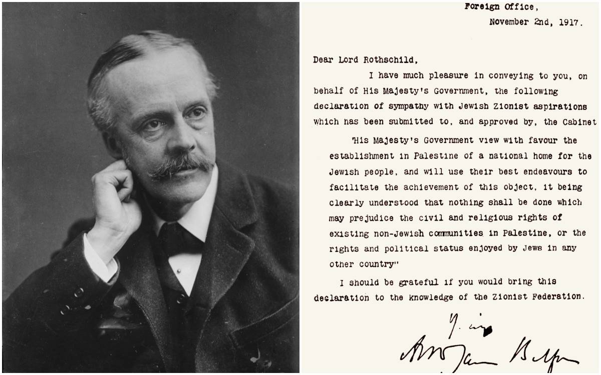 Majestelerinin hükümeti, Filistin’de Yahudi halkı için bir ulusal yurt kurulmasına olumlu bakmaktadır ve bu hedefe ulaşılmasını kolaylaştırmak için mümkün olan her şeyi yapacaktır. Filistin’de bulunan Yahudi olmayan toplulukların sivil ve dini haklarına veya Yahudilerin bütün diğer ülkelerdeki politik statü ve haklarına zarar verecek hiçbir şey yapılmayacaktır.