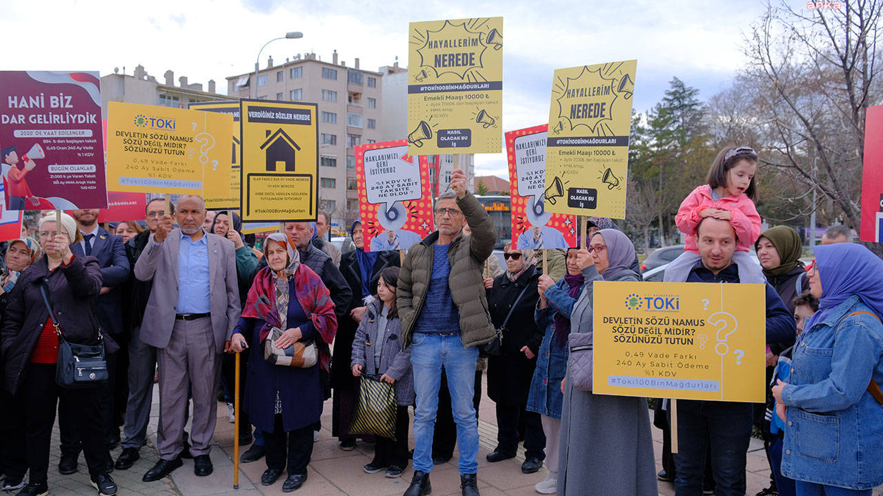TOKİ’den ev sahibi olma umuduyla konutlara başvuran ve yüksek taksitler ve faiz oranları ile karşı karşıya kalan mağdurlar, İstanbul, Maltepe ve Eskişehir’de bir araya gelerek basın açıklaması yaptı. “Mağdurlar burada, Murat Kurum nerede” sloganları atan yurttaşlar sorunlarının giderilmesini istedi. Yetkililere seslenen mağdurlar, “50 bin konut projesinde 1 milyona ev verdiniz. Bize ise 2 milyonla 4 milyon arasında ev verdiniz. Bizden 8 ay önce yaptığınız ihale ile bize 2 milyon kazık attınız. Biz yüzde 25 değil, yüzde 50 indirim ve sabit taksit istiyoruz” dediler.