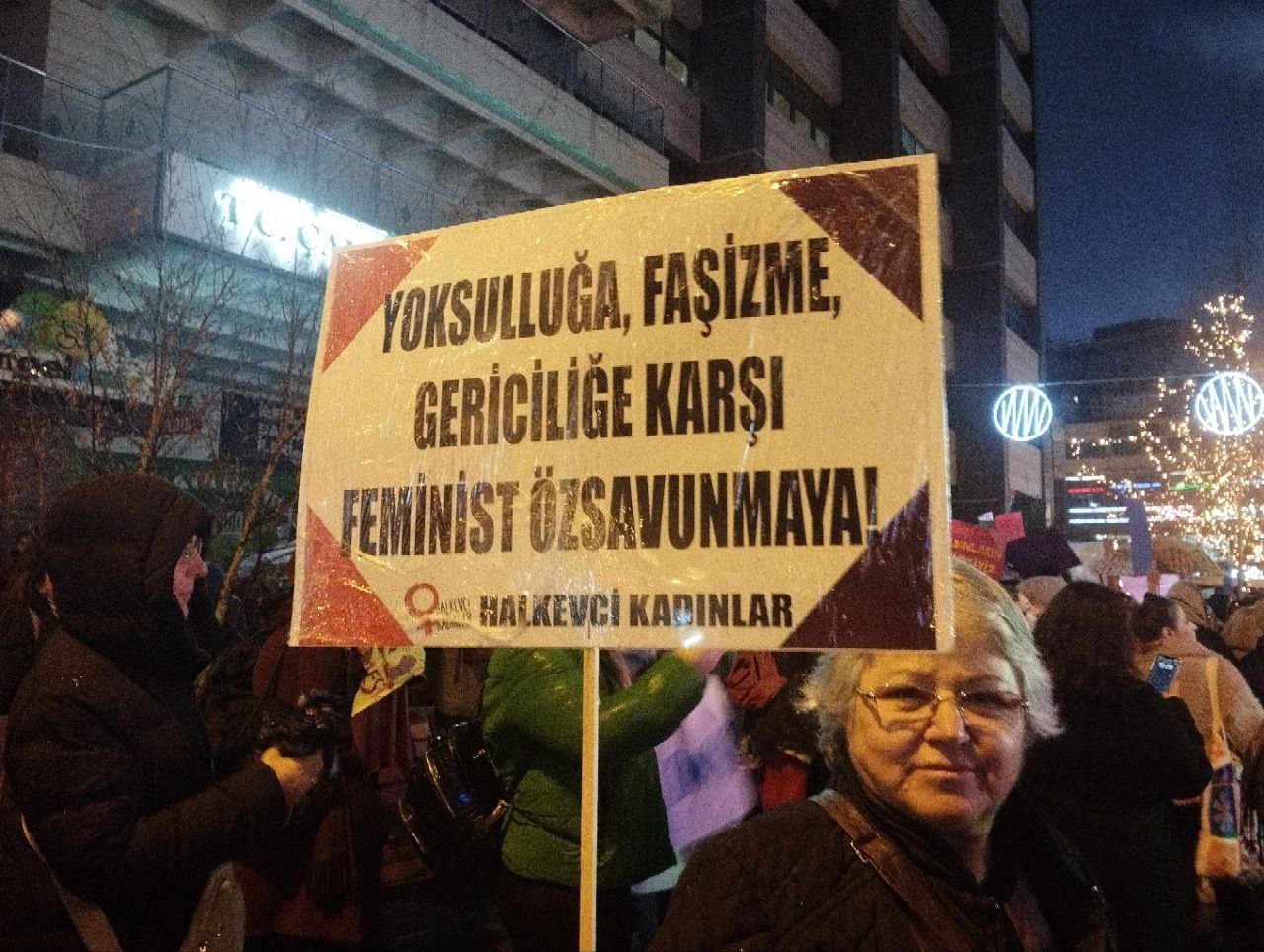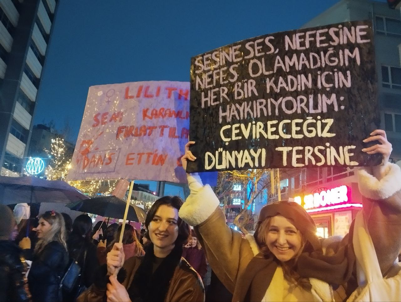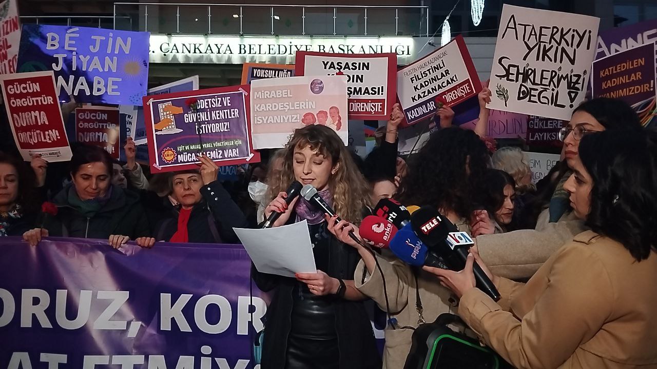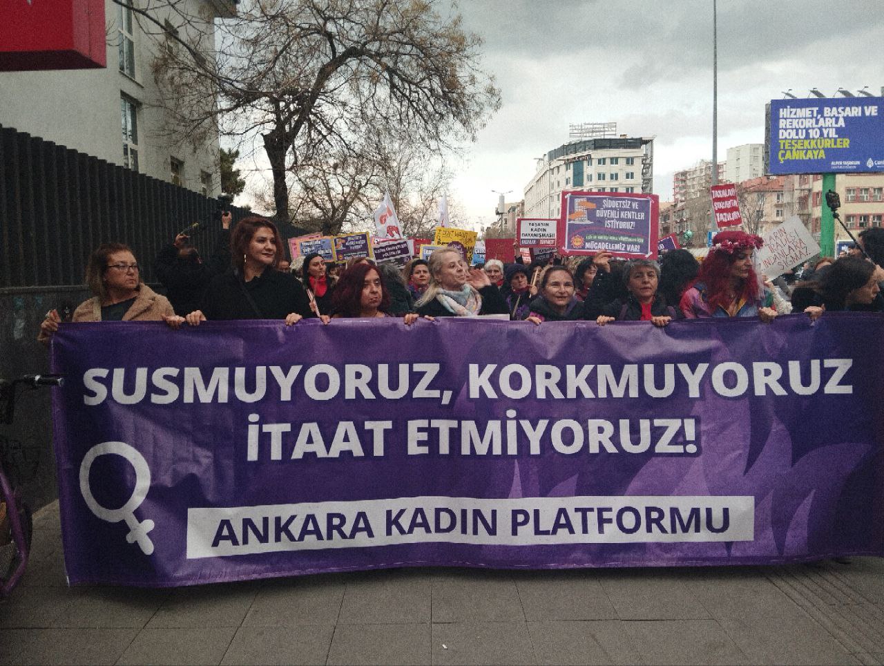 Ankara Kadın Platformu’nun çağrısıyla kadınlar “Savaşa, yoksulluğa, erkek-devlet şiddetine, haklarımıza saldırılara savaşa karşı; susmuyoruz, korkmuyoruz; itaat etmiyoruz!” diyerek Kolej Meydanı’nda toplanıp Sakarya Meydanı’na doğru yürümeye başladı