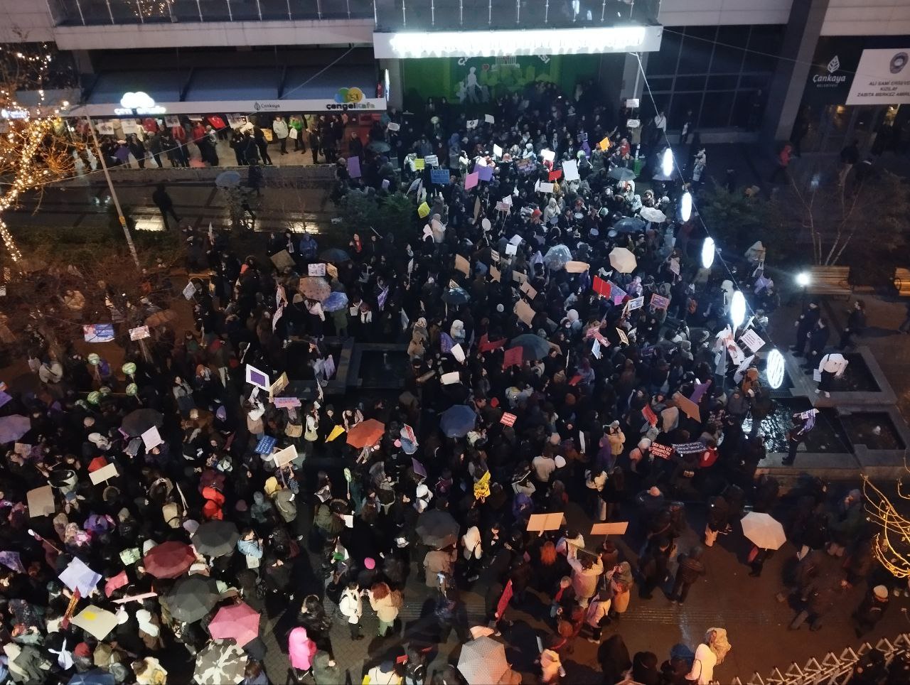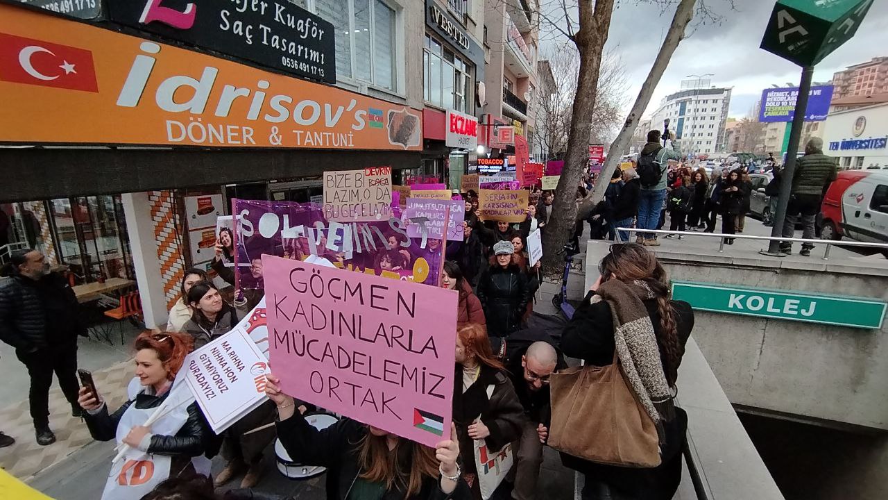 Ankara Kadın Platformu’nun çağrısıyla kadınlar “Savaşa, yoksulluğa, erkek-devlet şiddetine, haklarımıza saldırılara savaşa karşı; susmuyoruz, korkmuyoruz; itaat etmiyoruz!” diyerek Kolej Meydanı’nda toplanıp Sakarya Meydanı’na doğru yürümeye başladı.