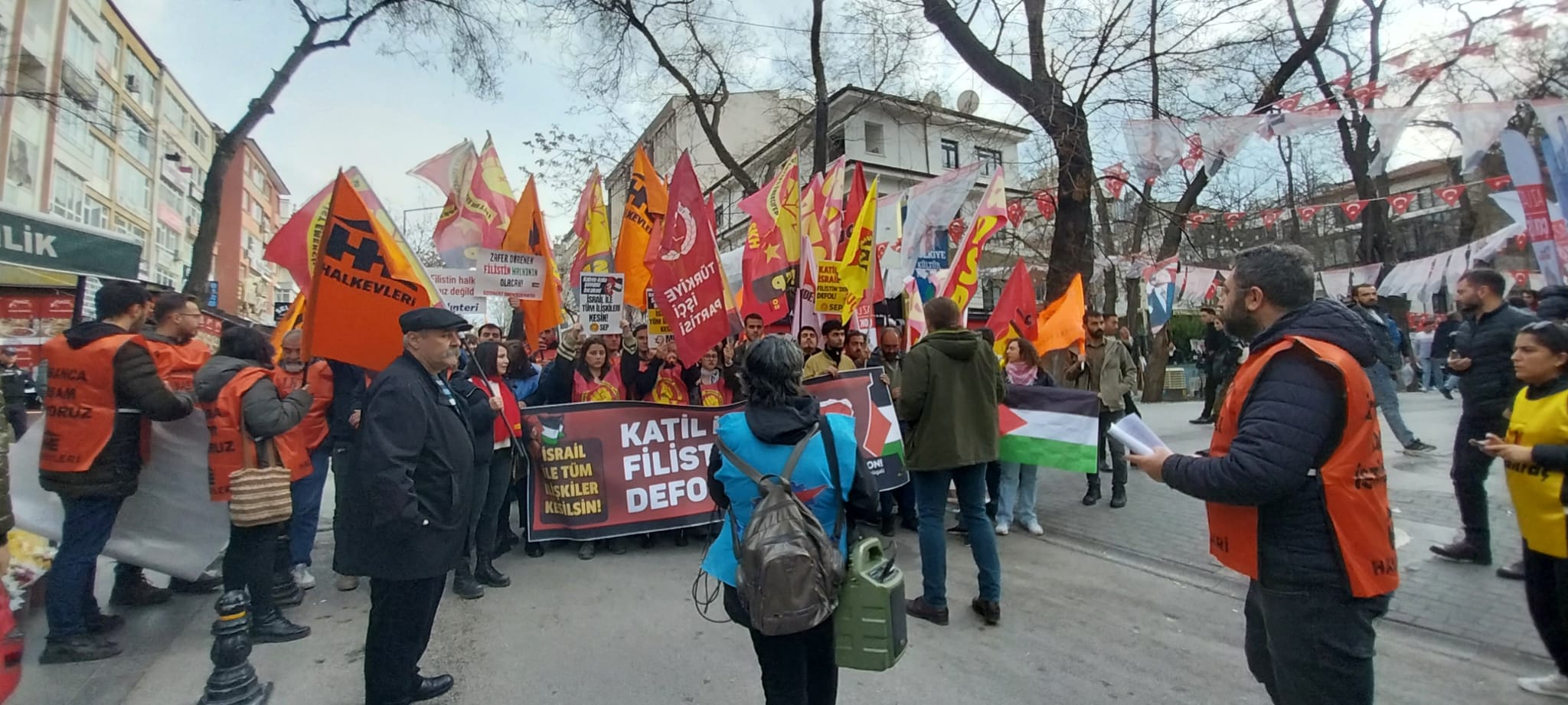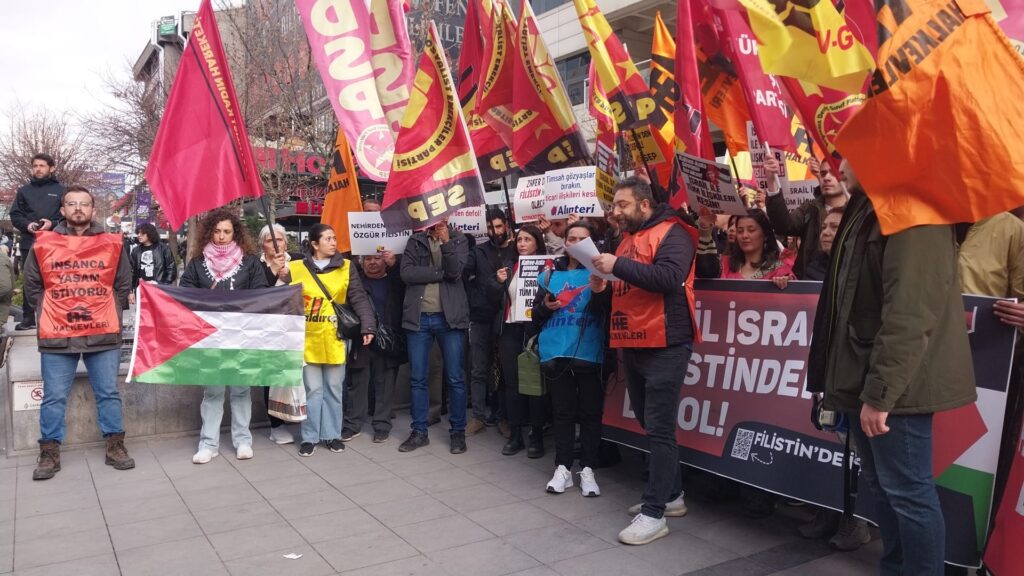 Filistin’de İşgale Son Platformu “7 Ekim’den bu yana on binlerce Filistinli katledildi. Siyonist İsrail ve işbirlikçileri bu katliamı sürdürmeye devam ediyor” diyerek bugün (17 Mart) saat 17.00’de Ankara Konur Sokak’ta bir araya geldi ve Sakarya Caddesi’ne doğru yürüdü. Eylemde “Katil İsrail, Filistin’den defol” yazılı bir pankart ile Filistin bayrağı taşındı. Sakarya Caddesi’ne varıldığında bir de “Filistin’de soykırım var. Filistin halkıyla dayanışmaya” yazılı pankart açıldı. Açıklamayı Serdar Kibar okudu.