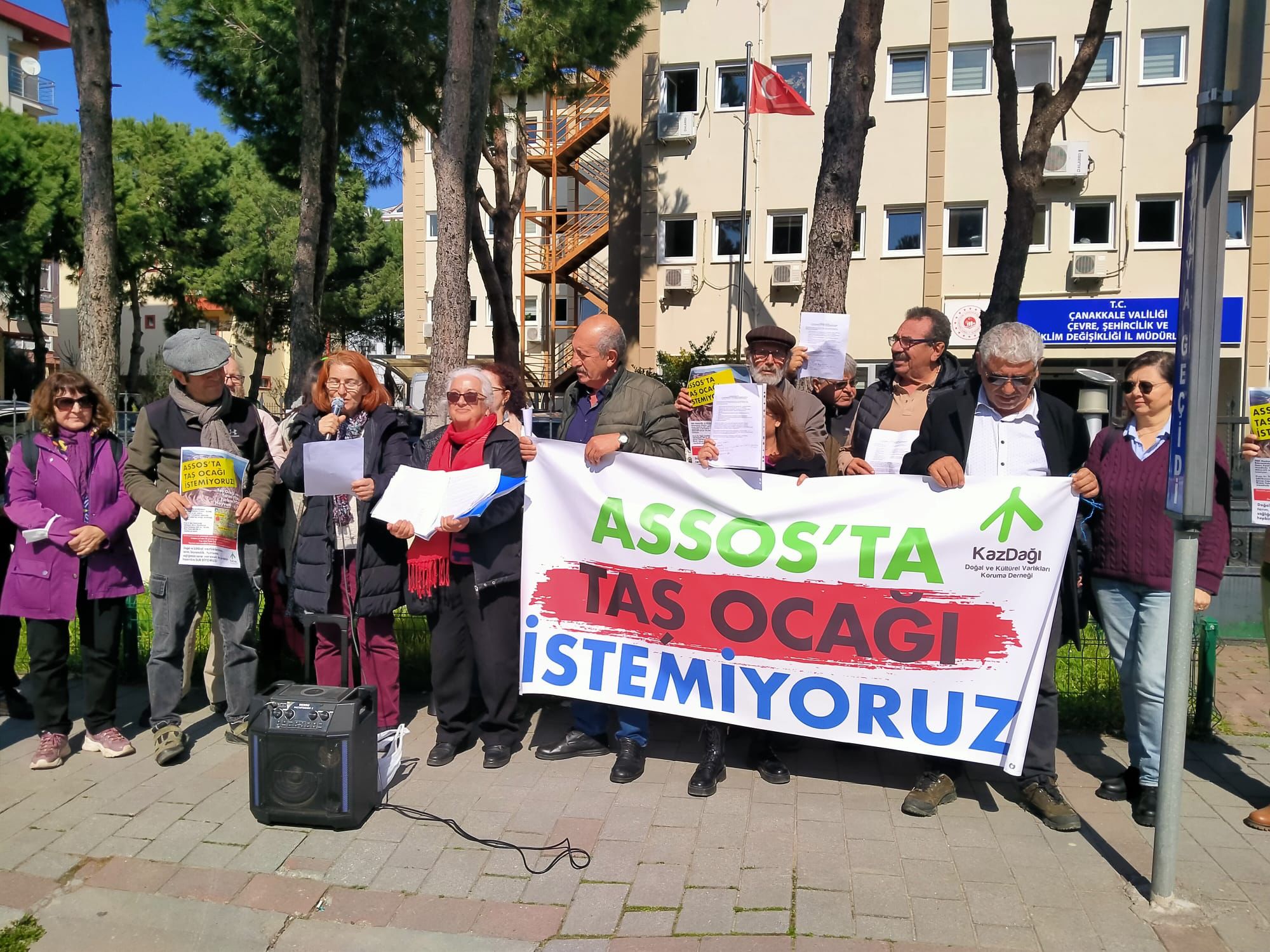 Kazdağı Doğal ve Kültürel Varlıkları Koruma Derneği Assos’ta yapılmak istenen Taş Ocağı’na karşı açıklama yaptı. ÇED süreci başlatılmış olan taş ocağına yönelik topladıkları imzaları teslim etmek üzere Çevre Şehircilik ve İklim Değişikliği İl Müdürlüğü’ne giden dernek bina önünde basın açıklaması yaptı. Dernek adına ve bireysel dilekçelerini ileten yaşam savuculuları Çevre Şehircilik ve İklim Değişikliği İl Müdürlüğü’nden sonra İl Kültür ve Turizm Müdürlüğü, DSİ 25. Bölge müdürlüğü 252. Şube Müdürlüğü, İl Tarım ve Orman Müdürlüğü ve Kültür Varlıklarını Koruma Bölge Kurulu Müdürlüğü’ne gitti. Kurumlarda yetkili kişilerle görüşüp dilekçelerini veren dernek üyeleri tüm kurumlardan projeye olumsuz görüş vermelerini istedi.