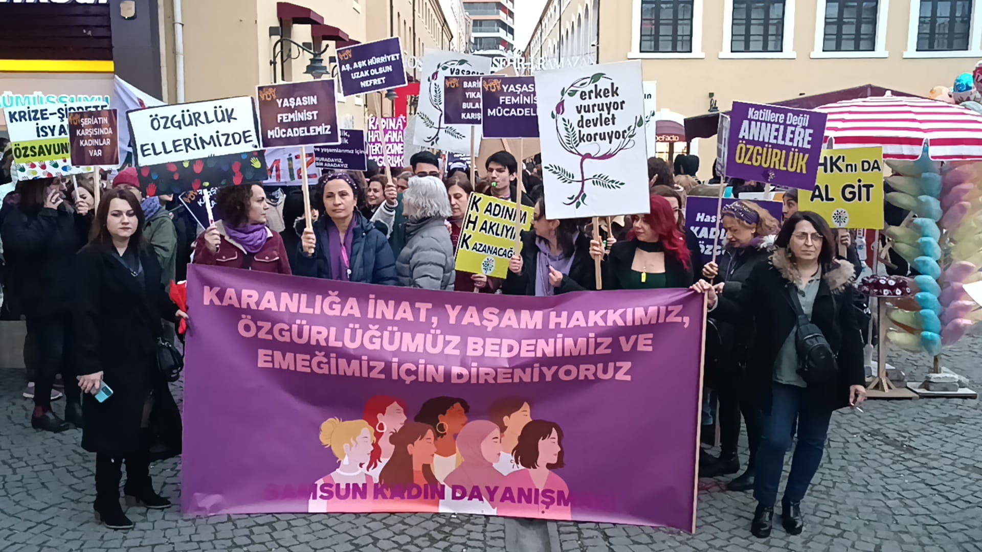 Samsun Kadın Dayanışması’nın çağrısıyla kadınlar eski Vergi Dairesi önünden Çiftlik Akbank önüne sloganlarla yürüdü. Yürüyüşün ardından yapılan açıklamada 8 Mart’ın tarihsel arka planına değinilirken 6284 Sayılı Kanun’un Medeni Kanun’da kadınların lehine olan maddelerin iktidarca hedef alınmasına dikkat çekildi. Gerici saldırılara karşı laikliği savunmaya devam edeceklerini belirten Samsunlu kadınlar, “Yaşamın her alanında sömürüye, ayrımcılığa, cinsiyetçiliğe, yoksulluğa, erkek ve devlet şiddetine karşı direnmeye ve örgütlü mücadelemizi büyütmeye devam ediyoruz” dedi.