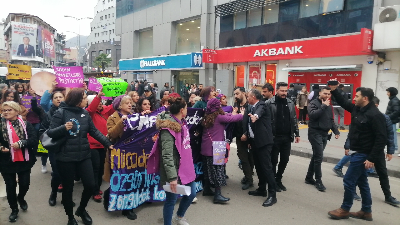 Zonguldak Kadın Platformu’nun çağrısıyla Madenci Anıtı’nda buluşan kadınlar önce sloganlarla eyleme başladı. Polis engellemeye çalışsa da kadınların kararlılığı sayesinde barikatlar açıldı, kadınlar Zonguldak Valiliği’ne yürüdü. Kadınlar polisin engelleme girişimine tepki göstererek “Kadınlar katledilirken sesi çıkmayanlar, kendi kentimizde yürürken önümüze engel koyamazlar. Engellemek istiyorsanız tarikatları, kadın cinayetlerini engelleyin” dedi.