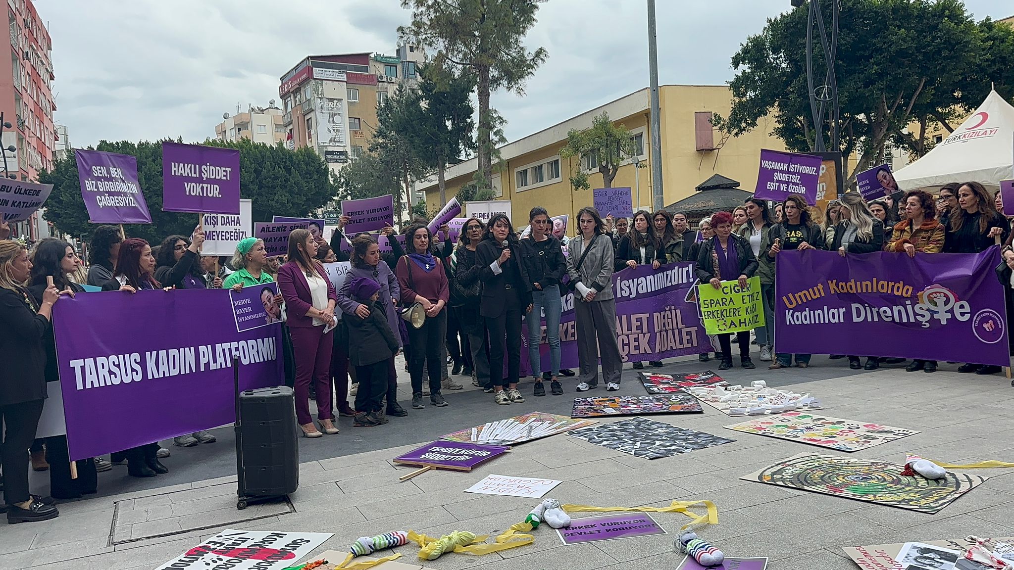 Tarsus Kadın Platformu’nun çağrısıyla kadınlar Yarenlik Alan’da buluştu. Halk Eğitim Merkezi önünden başlayıp Yarenlik Alan’ın tamamını sloganlarla yürüyen kadınlar, meydanda toplandı. Kadınlar geçtiğimiz günlerde boşandığı polis memuru Mustafa Yıldır tarafından öldürülen Mervegül Bayer’in fotoğraflarını da taşıdı.