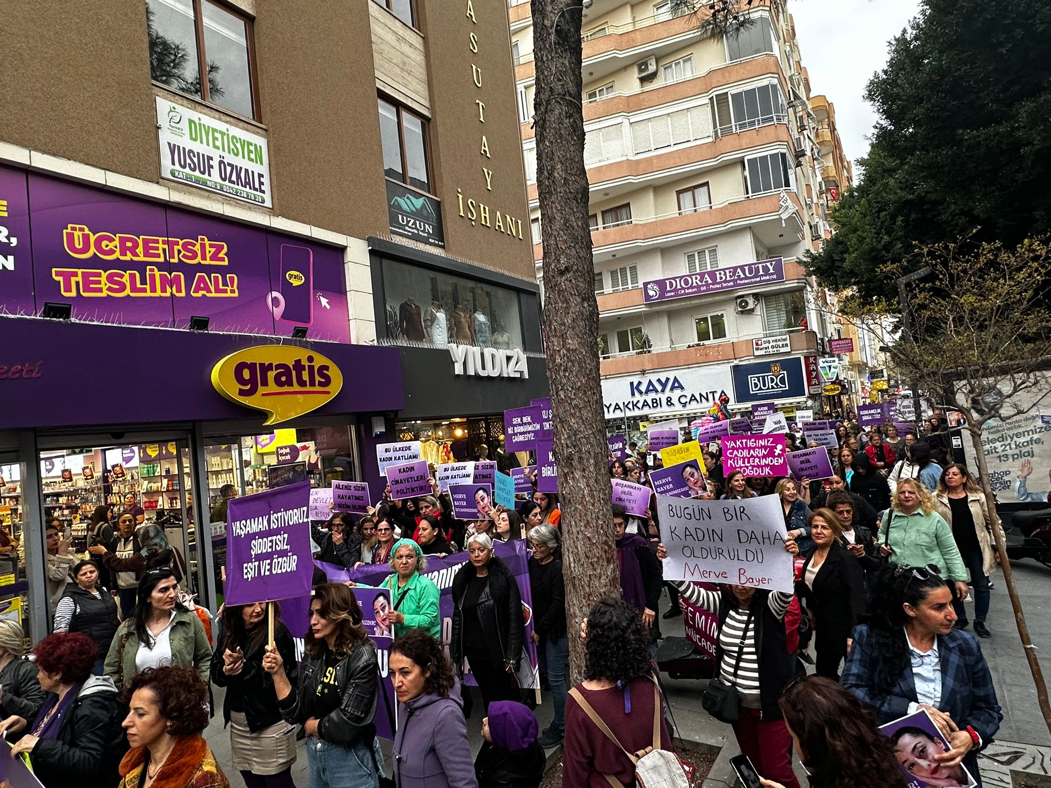 Uzaklaştırma kararı olmasına rağmen geçtiğimiz günlerde boşandığı polis memuru Mustafa Yıldır tarafından öldürülen Mervegül Bayer de eylemde unutulmadı. Kadınlar ve LGBTİ+’lar cinayetin münferit olmadığını, uzaklaştırma kararına rağmen gerekli önlemleri almayan devletin sorumluluğuna dikkat çekti.