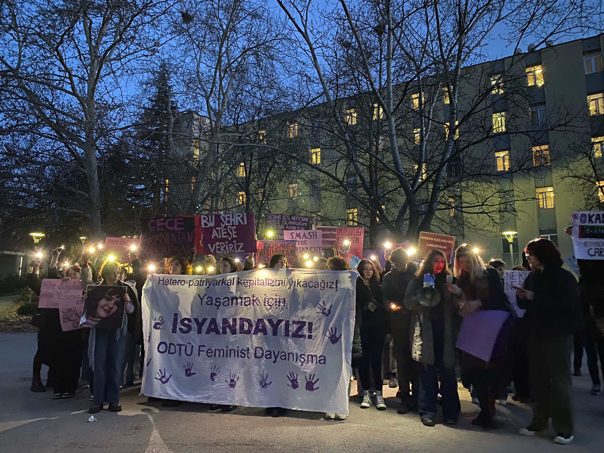 ODTÜ Feminist Dayanışması’nın çağrısıyla Matematik çimlerinde buluşan kadınlar ve LGBTİ+’lar “Hetero-patriyarkal kapitalizmi yıkacağız. Yaşamak için isyandayız” yazılı pankartı açarak Yurtlar Bölgesi’ne yürüdü.