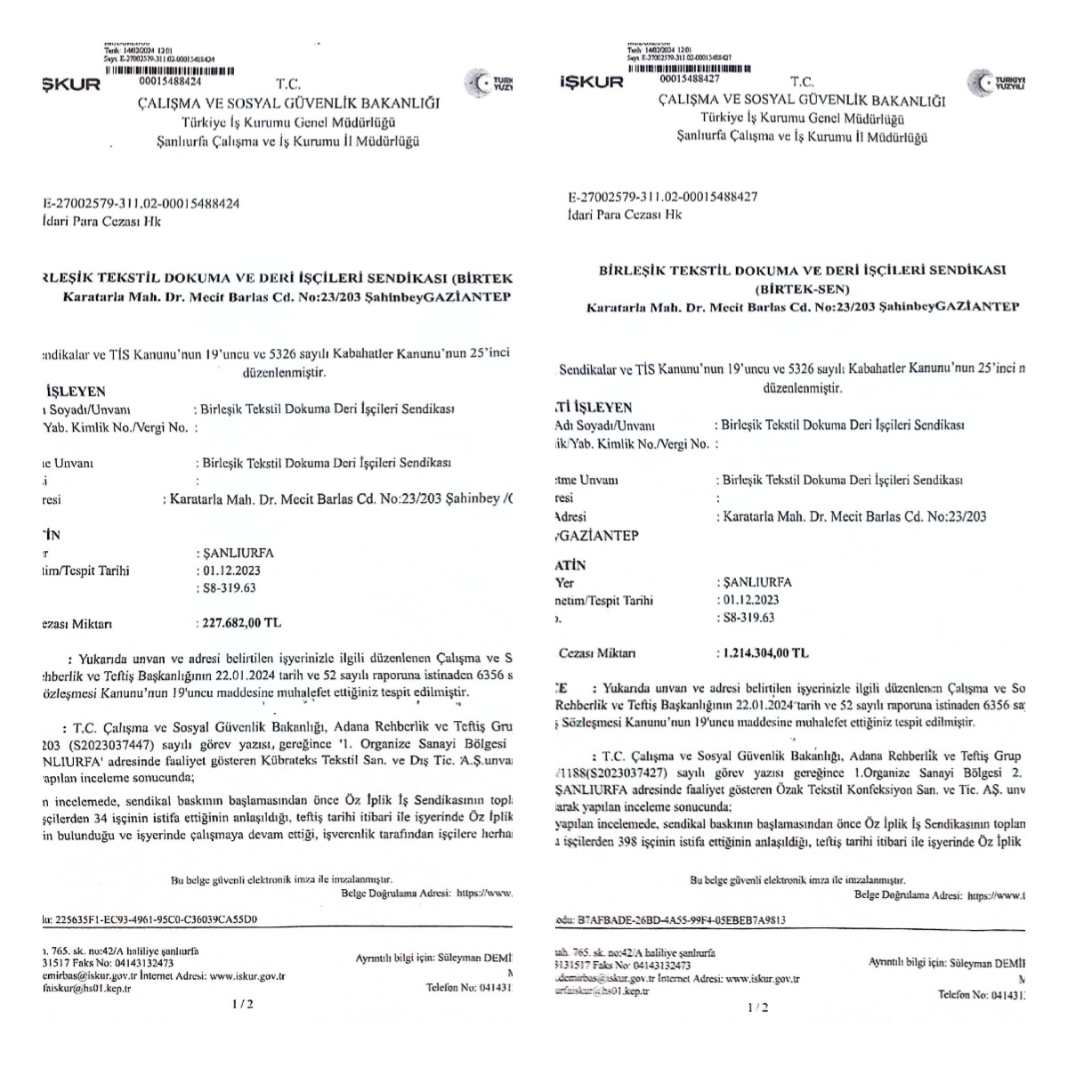 Çalışma ve Sosyal Güvenlik Bakanlığı, Birleşik Tekstil Dokuma ve Deri İşçileri Sendikası’na (BİRTEK-SEN), 1,5 milyon para cezası kesti. Bakanlık Özak Tekstil’de örgütlenen BİRTEK-SEN’in işçileri zorla Öz İplik-İş’ten istifa etmeye zorladığını iddia etti ve 6356 sayılı Sendikalar ve Toplu İş Sözleşmesi Kanunu’nun 19. maddesinden ceza verdi.