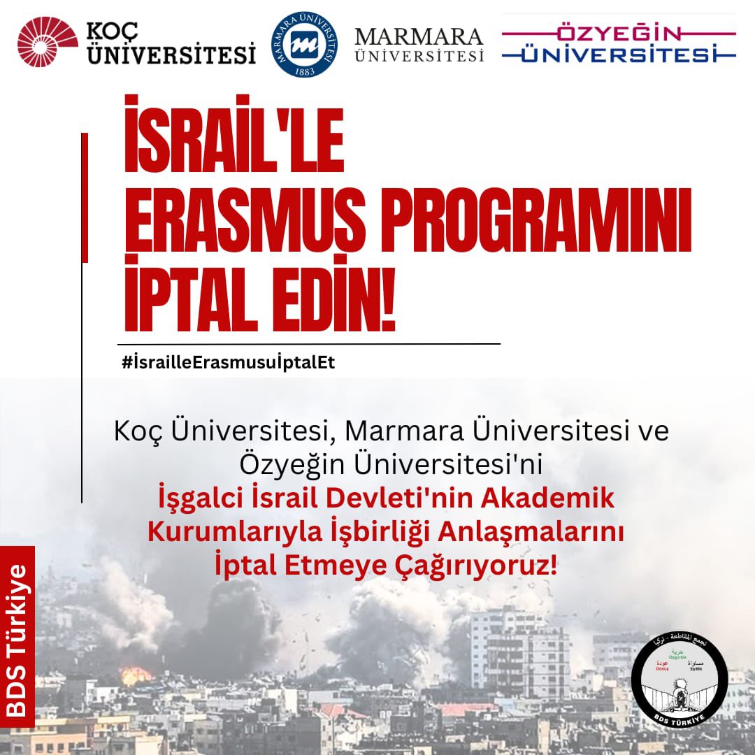 BDS Türkiye; Koç Üniversitesi, Marmara Üniversitesi ve Özyeğin Üniversitesi’ne İsrail ile Erasmus programını iptal etmeleri konusunda çağrıda bulundu.