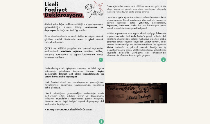 Lise öğrencilerinin geleceksizliğe, umutsuzluğa ve tek tipleştiren sınav sistemine karşı; eşit, özgür, demokratik ve bilimsel bir eğitim mücadelesini savunan Liseli Faaliyet deklarasyonu yayımlandı