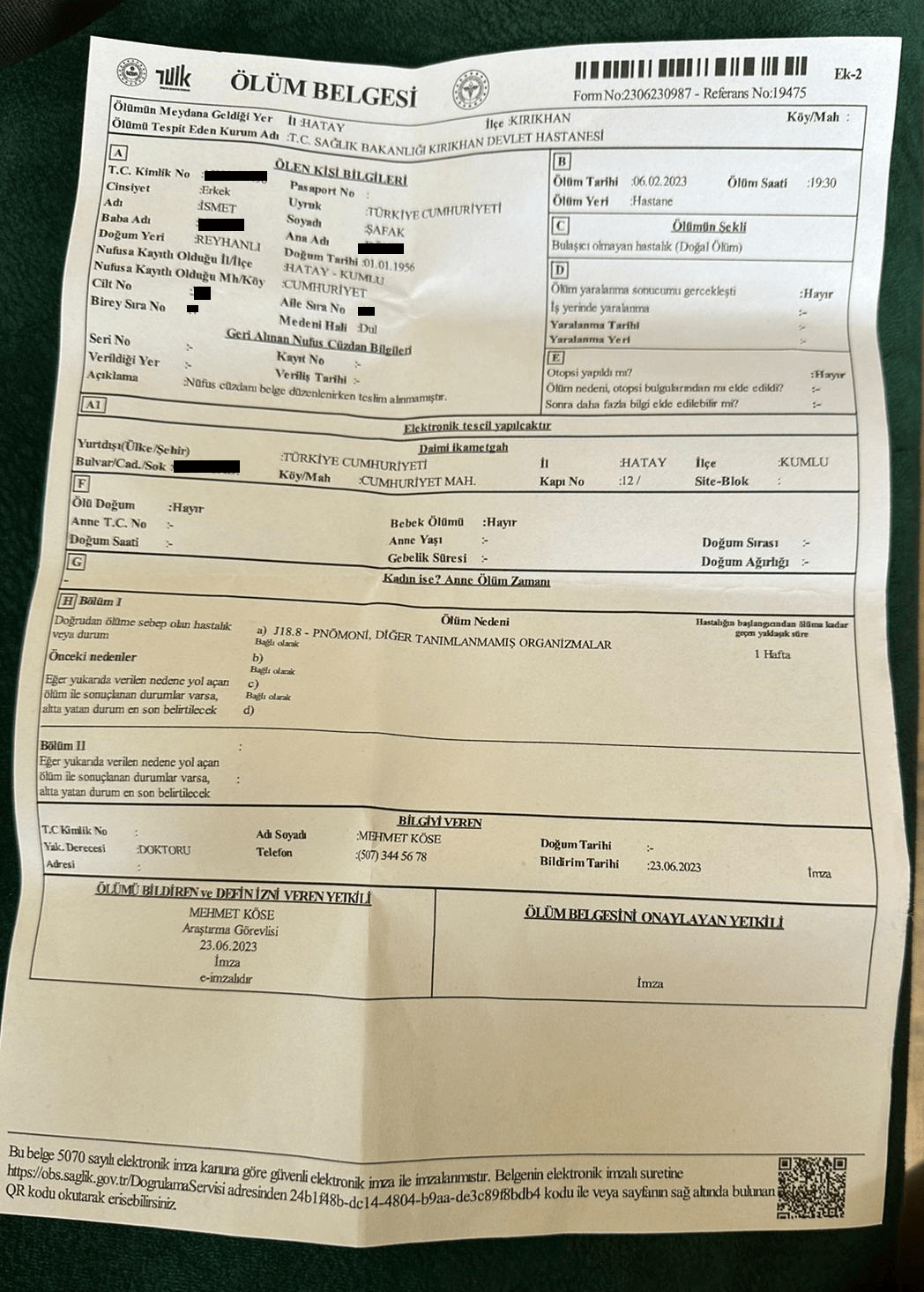 Müvekkilin ölüm nedeni ise “Doğal Ölüm” olarak belirtilmiştir. Ölüm saati olarak 06.02.2023 tarihli depremin ardından aynı gün saat 19.30 olarak yazılmıştır. Ekli belgeden anlaşılacağı üzere müvekkil neye ve nasıl tespit edildiğini bilmediğimiz şekilde depremin ardından 15 saati aşkın süre yaşadığı ve ardından vefat ettiği kayıtlara geçmiştir. Müvekkil “neden deprem nedeniyle yazmadınız” şeklinde itiraz edince belgeyi veren doktor, “deprem sonrası gelişen çoklu organ yetmezliği nedeniyle vefat etmiştir” ibaresini eklemiştir.