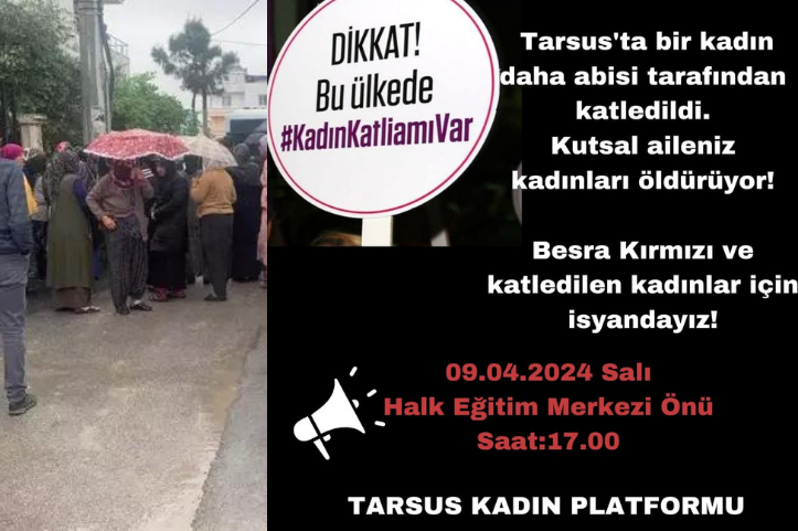 Besra Kırmızı (20) isimli hamile kadın Mersin’in Tarsus ilçesinde sağlık ocağından dönerken ağabeyi tarafından ateşli silahla katledildi. Tarsus Kadın Platformu eylem çağrısı yaptı