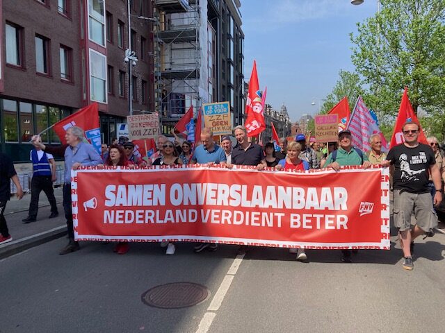 14.30’da yürüyüşe geçildi. Büyük ana pankartın ardından FNV Genel Başkanı Tuur Elzinga ve FNV yöneticileri pankartı tutarak yürüdüler. Yürüyüş güzergahı boyunca işçi ve emekçiler sorunlarını dile getiren pankart ve sloganlarla seslerini duyurdular.