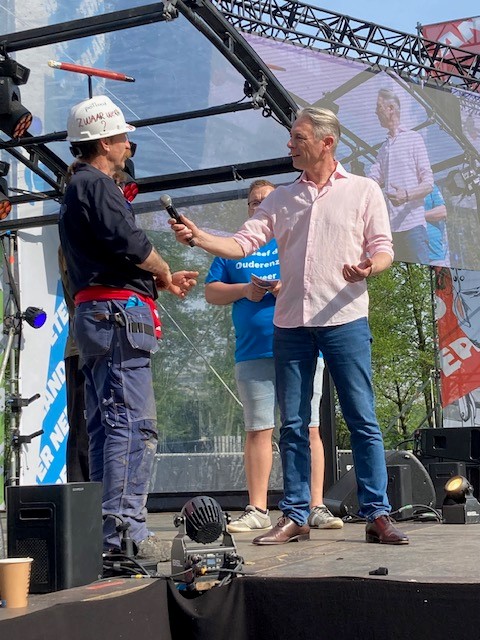 Saat 16.00’da Martin Luther King Parkı’na gelindi. FNV’nin yaptığı hazırlıklar oldukça beğeni topladı. Büyük görkemli sahnede ilk konuşmayı FNV Genel Başkanı Tuur Elzinga yaptı. Ülkesel ve uluslararası genel duruma değindi. Farklı sektörlerden işçiler sahneye çağrıldı. Sahneye çıkan işçiler sektörleriyle ilgili sorunlarını ve düşüncelerini anlattı. Tuur Elzinga ağır işkollarında çalışanların 3 yıl önceden emekli olabilmeleri için hükümete son bir çağrıda bulundu. 15 Mayıs’a kadar bir iletişim ve girişimde bulunulmazsa sendikal hareketin gücünü her alanda kullanacaklarını belirtti. Oldukça coşkulu bir hava estirdi ve büyük alkış aldı. Ardından diğer konuşmacılar sektörleriyle ilgili fikirlerini ve sorunlarını anlattı.