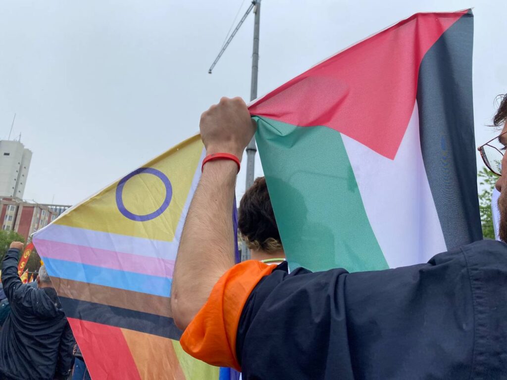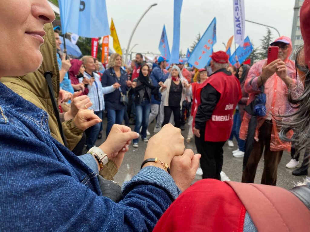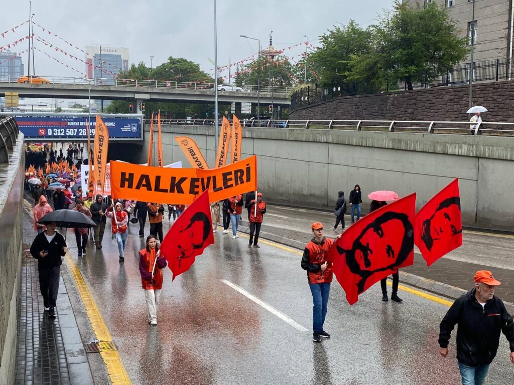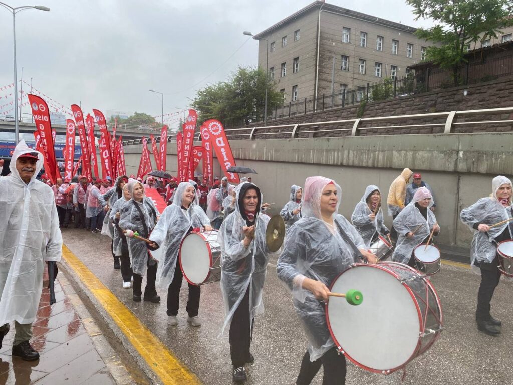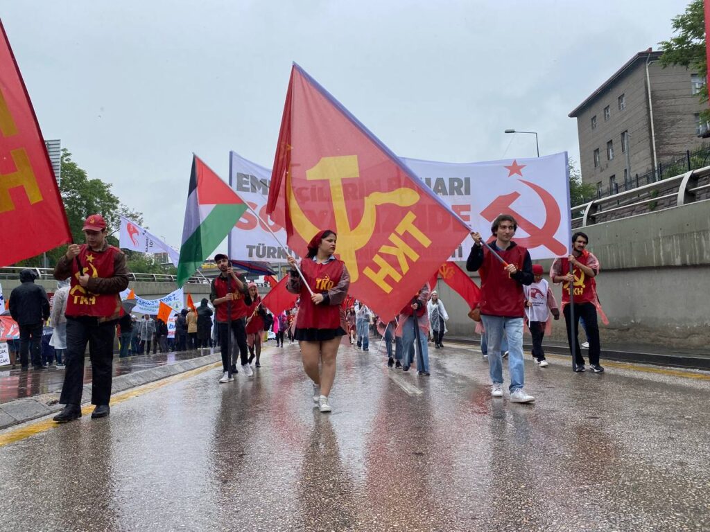 Ankara’da 1 Mayıs’a gelenler AKM önünde buluştu. Toplanan kitle Tandoğan Meydanı’na yürüdü. Yağmur sebebiyle katılım etkilense de çok büyük oranda azalmadı. Yürüyüşte Filistin’e desten için bayraklar ve dövizler yer alırken hayat pahalılığı, yoksulluk, asgari ücrete zam talebi gibi birçok talep alana taşındı