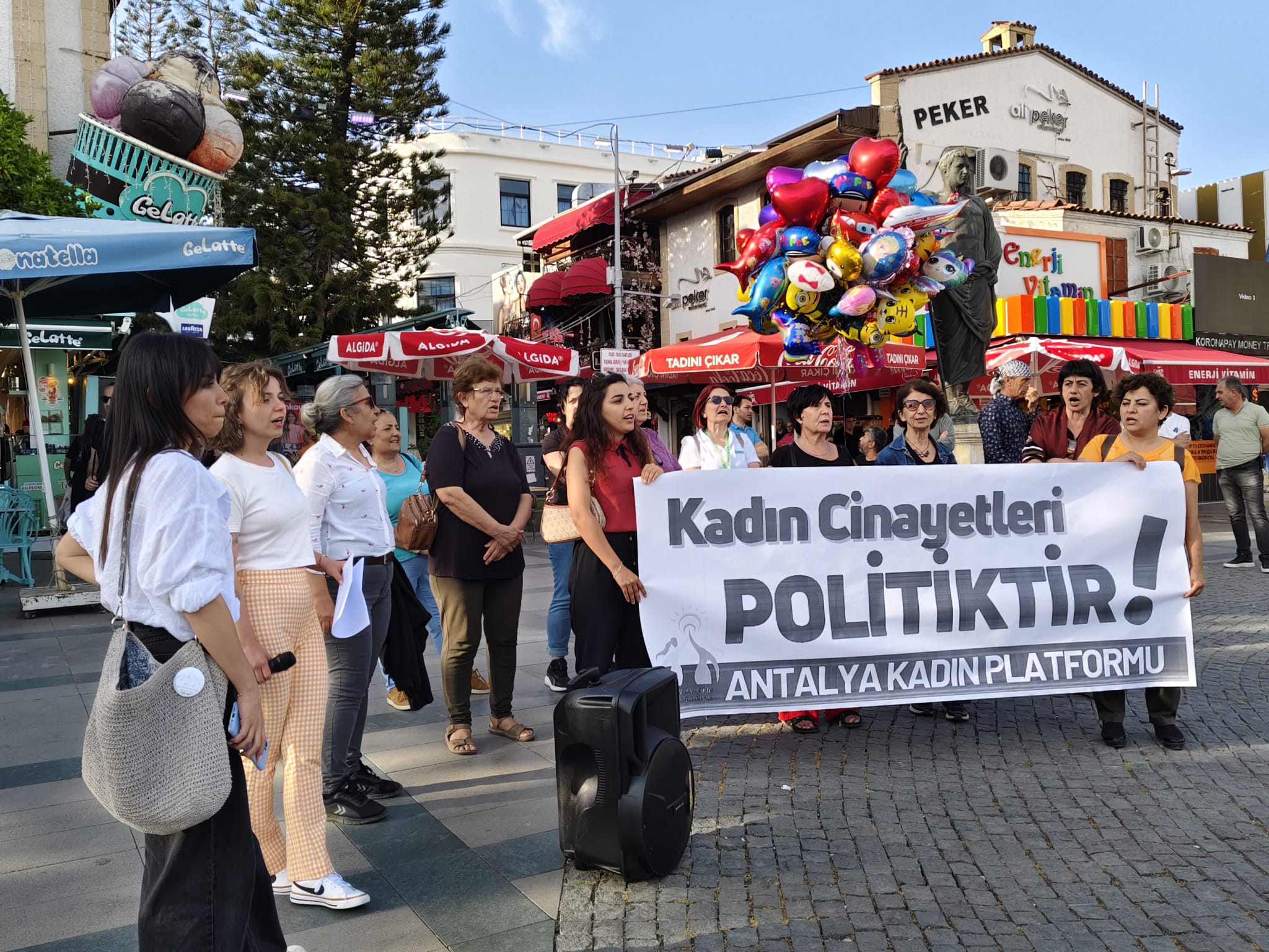 Antalya Kadın Platformu’nun çağrısıyla bugün (9 Mayıs) saat 18.00’de Attalos Meydanı’nda bir araya gelenler “Kadın cinayetleri politiktir” yazılı pankart açarak eylem yaptı. Eylemde bir basın açıklaması yapıldı. Eylemde sık sık “Susmuyoruz, korkmuyoruz, itaat etmiyoruz” ve “Erkek adalet değil, gerçek adalet” sloganları atıldı.