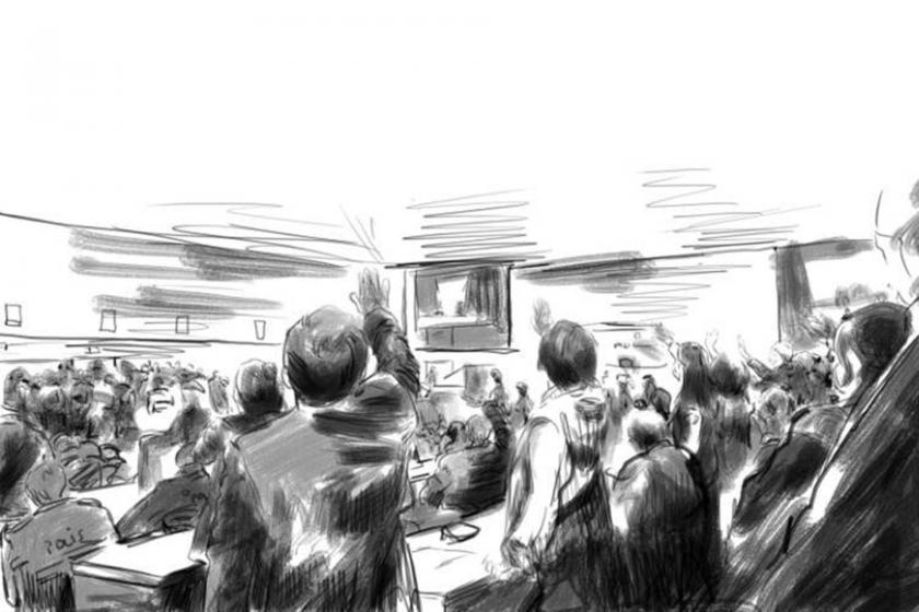 Hükmün açıklandığı sırada avukatlar mahkeme heyetini protesto ederek ıslıklar ve sloganlarla duruşma salonunu terk etti.