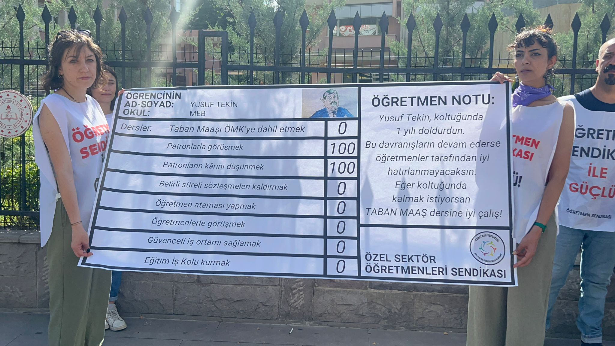 Bakanlığın önüne gelen öğretmenlerin pankart şeklinde hazırladıkları karnede öğretmen atamaları, taban aylık gibi konularda Bakan Tekin’e ‘sıfır’ verilirken, ‘patronlarla görüşme’ dersinden ise 100 puan verildi.