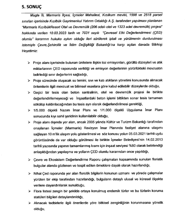 Dokuz Eylül Üniversitesi Çevre Mühendisi Doç. Dr. Serkan Eker, Ege Üniversitesi Biyolog Doç. Dr. Ademi Fahri Pirhan, Muğla Sıtkı Koçman Üniversitesi Yüksek Orman Mühendisi Öğr. Gör. İnşaat Muğla Sıtkı Koçman Üniversitesi Yüksek Mühendisi Gürkan Demiröz, Mustafa Afşin Erdoğan ve Harita Kadastro Mühendisi imzası Şükrü Mercimek imzasını taşıyan bilirkişi raporuna dayanılarak reddedilen dosyamızı temyiz için Danıştay’a götürmüştük.