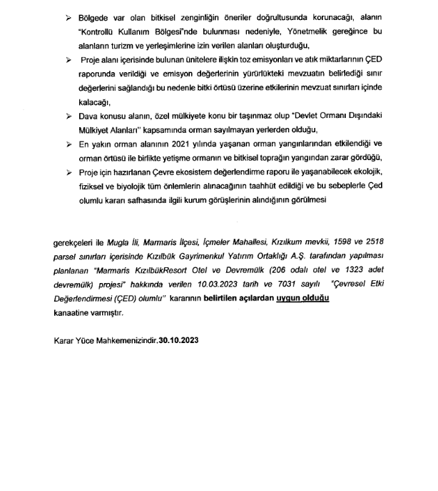 Muğla İli, Marmaris İlçesi, Kızılkum Mevkiinde yapılmak istenen Marmaris Kızılbük Resort Otel ve Devremülk (206 odalı otel ve 1323 adet devremülk) Projesi hakkında Çevre, Şehircilik ve İklim Değişikliği Bakanlığı Çevresel Etki Değerlendirmesi, İzin ve Denetim Genel Müdürlüğü tarafından verilen “Çevresel Etki Değerlendirmesi (ÇED) Olumlu” kararının iptali istenilmişti. Danıştay 4. Dairesi, Sinpaş ÇED Olumlu davasında temyiz istemini kabul etti. Davada yeniden bir karar verilmek üzere dosyanın anılan İdare Mahkemesine gönderilmesine karar verildi.