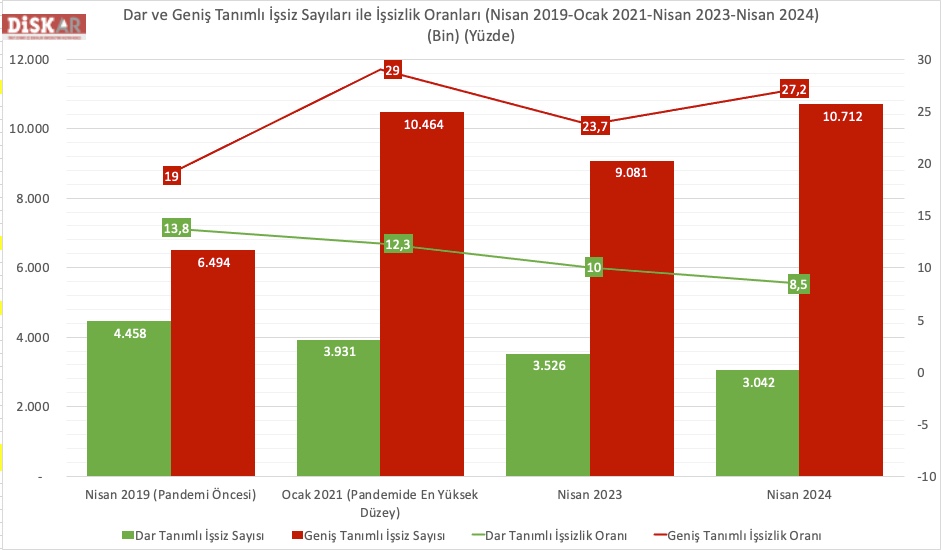 DİSK-AR’ın hesabına göre geniş tanımlı işsiz sayısı 9 milyon 81 binden 10 milyon 712 bine yükseldi. Nisan 2024’te pandemi dönemi dahil en yüksek geniş tanımlı işsiz sayısına ulaşıldı.