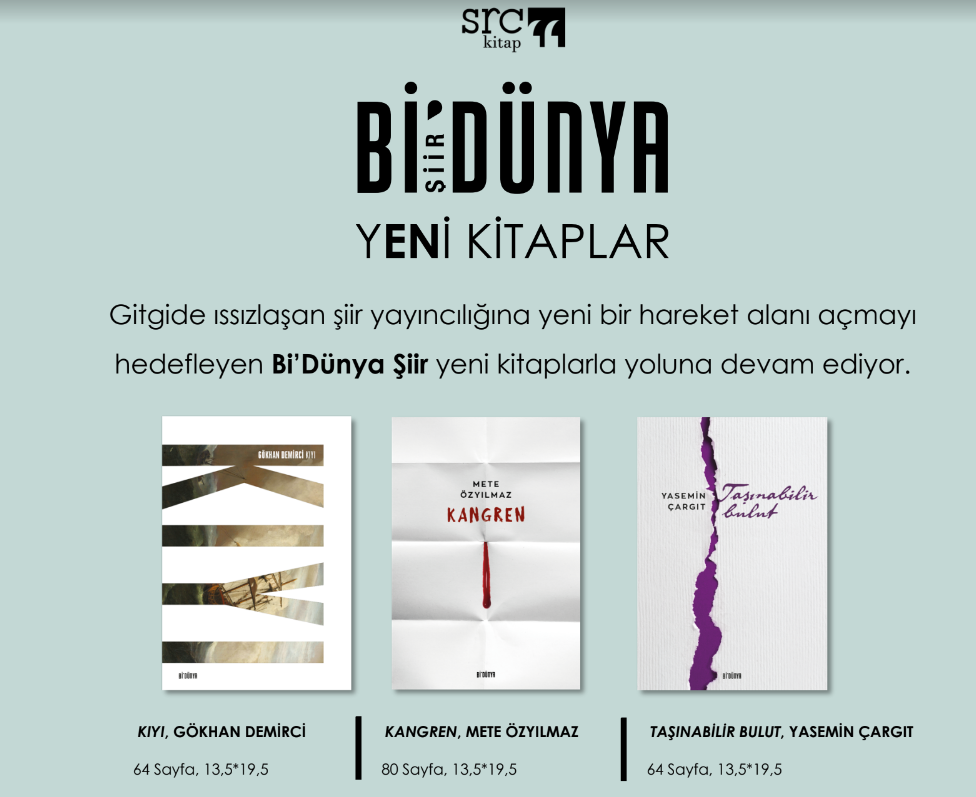 SRC Yayınevi’nin yeni markası Bi’Dünya Şiir’in yayımladığı yeni kitaplar Gökhan Demirci’den Kıyı, Yasemin Çargıt’tan Taşınabilir Bulut ve Mete Özyılmaz’dan Kangren raflardaki yerini aldı