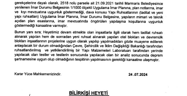 Marmara Kent Konseyi, Muğla 3. İdare Mahkemesinde devam eden ruhsat iptal davasında bilirkişi raporunun açıklanması üzerine bir basın açıklaması yayımladı. Bilirkişi raporunda Sinpaş’a verilen ruhsatların mevzuata uygun olmadığı raporlandı