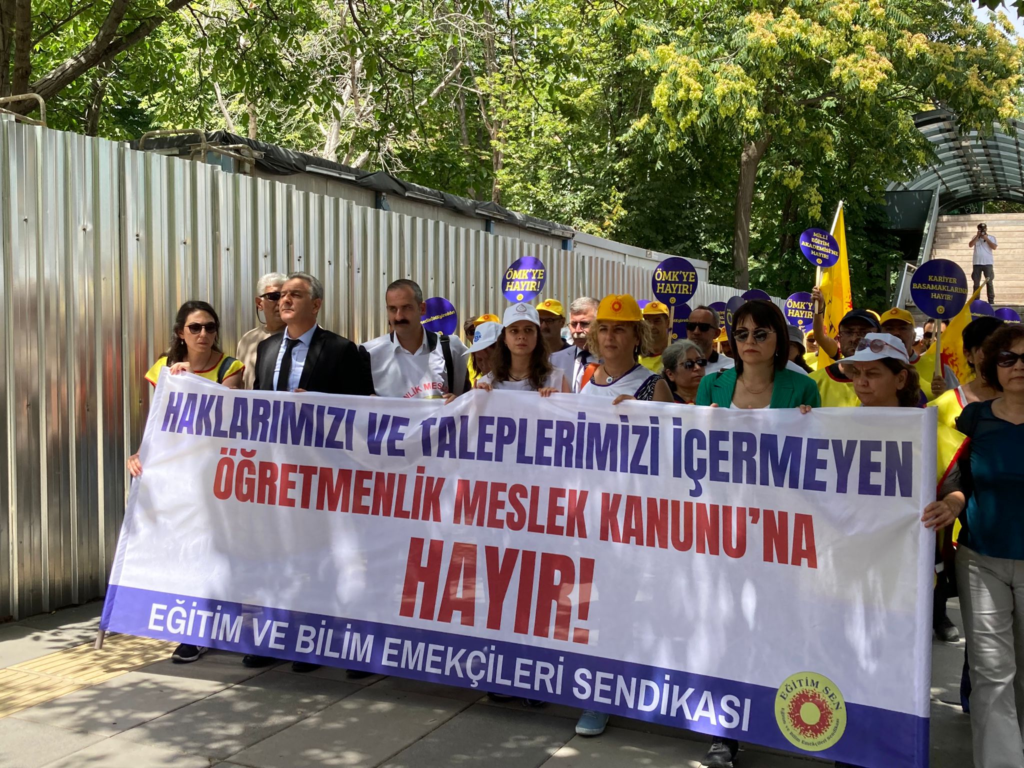 Öğretmenlik Meslek Kanunu tasarısının görüşmeleri Meclis komisyonunda yapılırken Eğitim Sen de “Tasarı geri çekilmeli” diyerek bir basın açıklaması yaptı. Eğitim-Sen, MEB önünde toplandıktan sonra TBMM önüne yürüdü