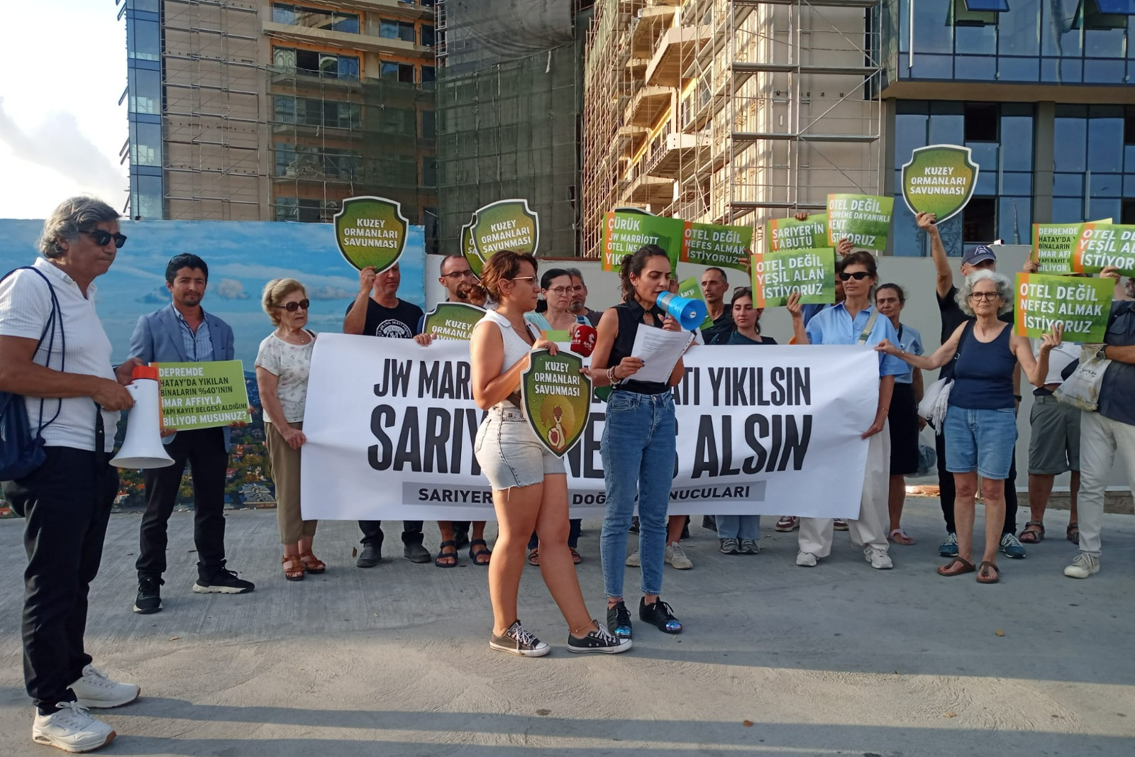 Sarıyer’in Hacıosman kavşağında bulunan JW Marriott otel inşaatının durdurulması ve yıkılması talebiyle toplanan kent ve doğa savunucuları 1989 yılından beri kaba inşaat halinde bulunan, Danıştay ve Bakanlık tarafından ruhsatı iptal edilmiş, daha önce Sarıyer Belediyesi tarafından da mühürlenmiş bu yapının barınma kullanımına açılmasının bir katliama vesile olacağını belirttiler. Binanın 34 yıl boyunca yağmur suyu, rüzgar gibi çeşitli hava olayları nedeniyle korozyona uğradığını vurgulayan kent doğa savunucuları, İstanbul İl Çevre ve Şehircilik Müdürlüğü’nün, Sarıyer Belediyesi ve İstanbul Büyükşehir Belediyesi’nin bu konuda sessiz kaldıklarına, bu durumdan sorumlu olduklarına dikkat çektiler.