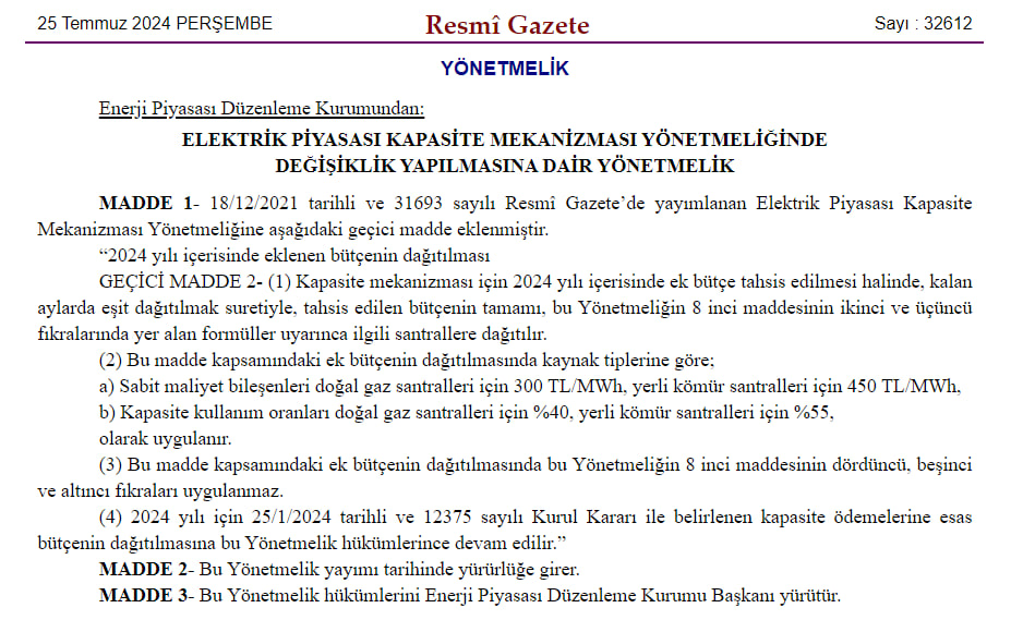 Şirketin imdat çağrısı devletten karşılığını buldu. Enerji Piyasası Düzenleme Kurumu (EPDK), Elektrik Piyasası Kapasite Mekanizması Yönetmeliği’nde değişikliğe gitti. Bugün (25 Temmuz) Resmi Gazete’de yayımlanan yönetmeliğe “2024 yılı içerisinde eklenen bütçenin dağıtılması” geçici maddesi eklendi.