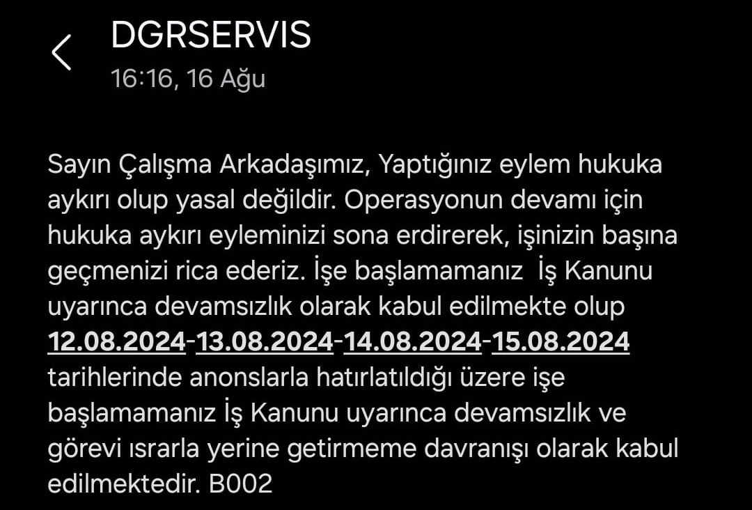 CarrefourSA’nın Esenyurt’taki deposunda çalışan işçiler maaş zammı ve İSİG önlemlerinin alınması talebiyle başlattıkları direnişin 5. gününde. İşçilerin bağlı olduğu taşeron firma DGR, bugün işçilere attığı mesajda yapılan eylemin hukuksuz olduğunu, devam etmeleri halinde bunun ‘devamsızlık’ olarak sayılacağını ifade ederek işten atmakla tehdit etti.