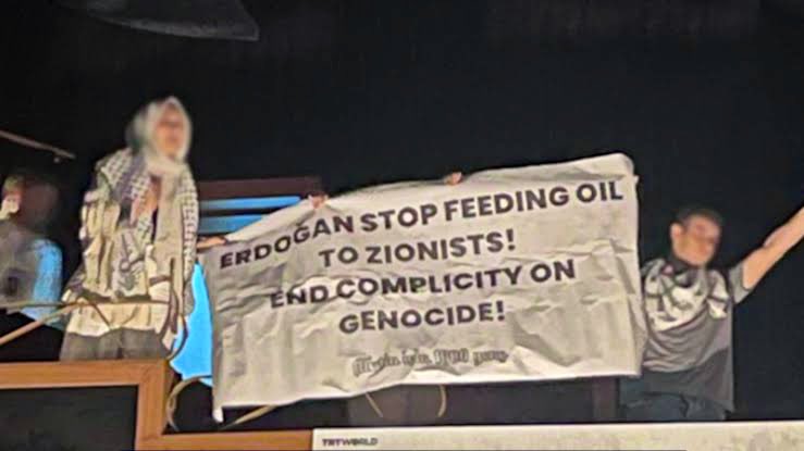 Eylemciler salonda “Erdoğan, Siyonistleri petrolle beslemeyi bırak! Soykırıma suç ortaklığına son verin” yazılı pankart açmıştı.