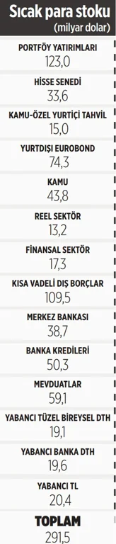 Dar tanımlı, yani kredileri dışarıda bırakan, sıcak parayı portföy yatırımları ve yabancı mevduatla sınırlayan yaklaşıma göre de;123,0 +59.1 =182,1 milyar dolar.