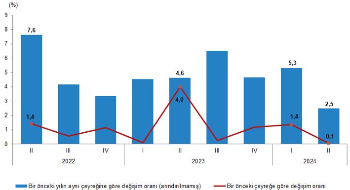 TÜİK 2024 yılı ikinci çeyrek büyüme verilerini yayımladı. TÜİK verilerine göre ikinci çeyrekte milli gelir bir önceki yılın aynı çeyreğine göre yüzde 2,5 arttı. Ancak bir önceki çeyreğe göre büyüme oranı yüzde 0,1’de kaldı.