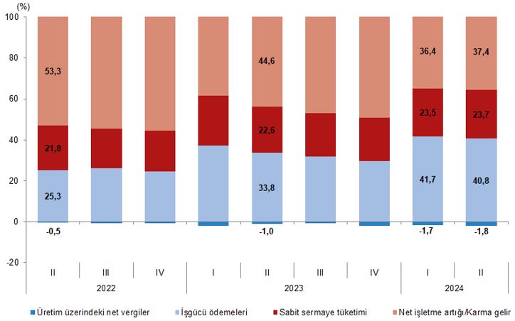 Milli gelirden emeğin aldığı pay, geçen yılın aynı çeyreğine göre hâlâ yüksek. Geçen yılın ikinci çeyreğinde yüzde 33,8 iken, bu oran 2024 yılında yüzde 40,8 oldu. Ancak bu tablonun ortaya çıkmasında, EYT düzenlemesiyle birlikte emekli aylığı bağlananların sayısında artış ve tazminat ödemeleri etkili. Bir önceki çeyrekle kıyaslama yapıldığında yüzde 41,7’den yüzde 40,8’e düşüş olduğu görünüyor.